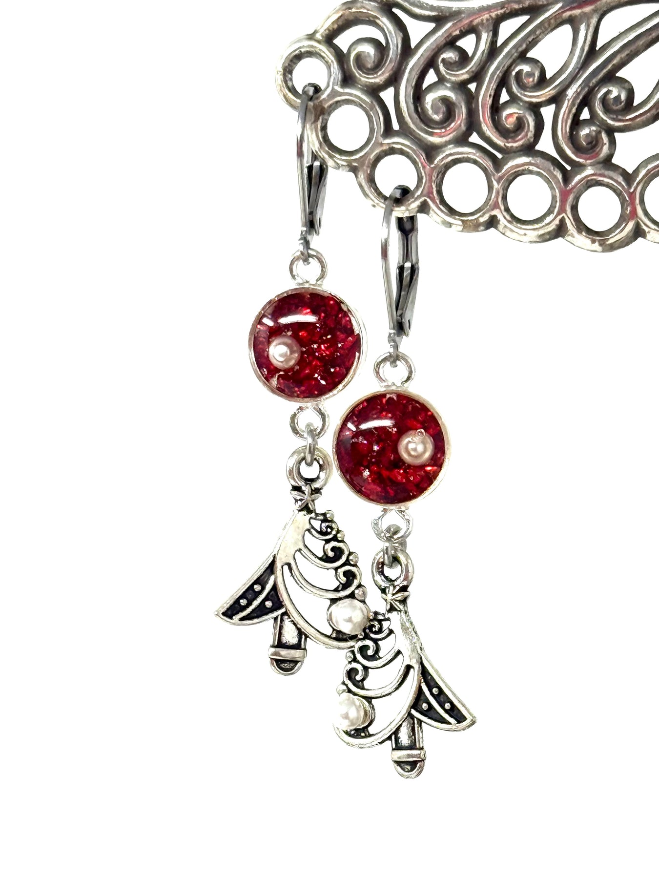A true testament to fine craftsmanship, these stunning Christmas Tree Earrings are festive, elegant works of wearable art. Each earring features a gorgeous round bezel bead filled with red glitter and white pearl accents complemented by an ornate antique pewter Christmas tree charm adorned with tiny white pearls that add texture and dimension.
