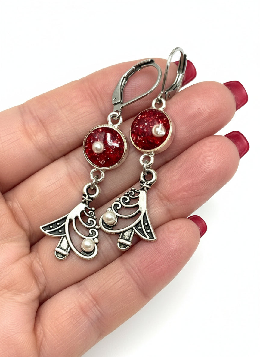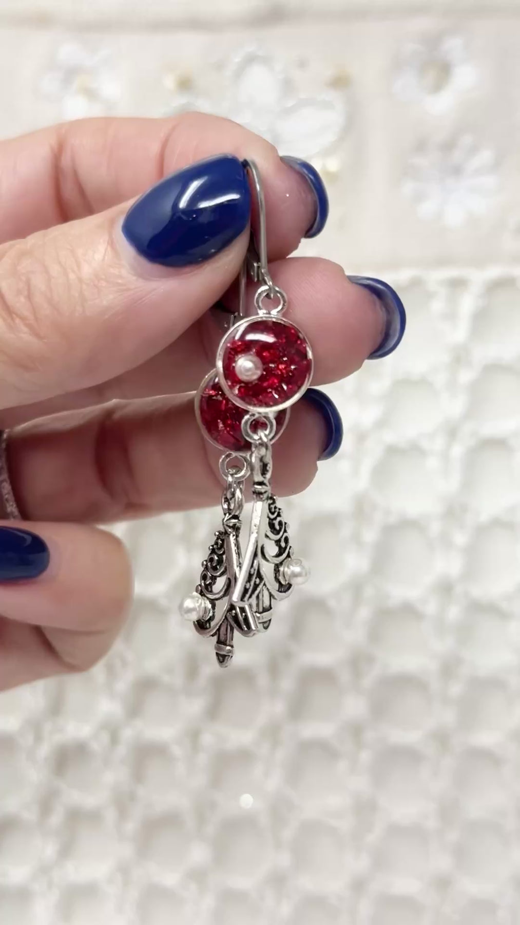 "These Christmas tree earrings are absolutely stunning! The red glitter bezel beads with the little white pearls are so eye-catching, and the pewter tree charms with their tiny pearl accents are just precious. They're surprisingly lightweight for how substantial they look. I love the elegant combination of sparkle and vintage charm - perfect for the entire holiday season!"