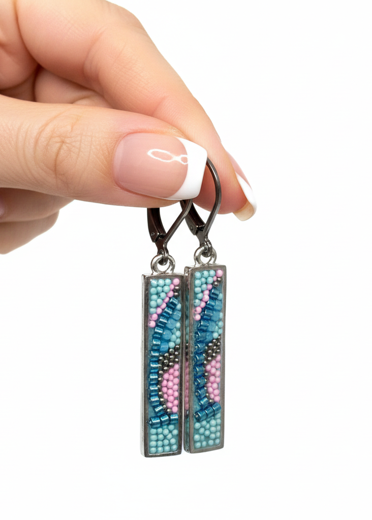 Playful coastal hues shimmer in these delightful earrings featuring oxidized pewter rectangle bezels filled with glass seed beads, metallic glass seed beads, and micro-pearls in pale blue, pink, and teal tones arranged in a gorgeous geometric ombre mosaic pattern. Each tiny bead is meticulously hand-set to create brilliant shimmer and dimensional depth that shifts as you move. The pastel pale blue, pink, and teal tones blend together beautifully with metallic accents, creating vibrant, cheerful color perfect for summer and beach lovers.