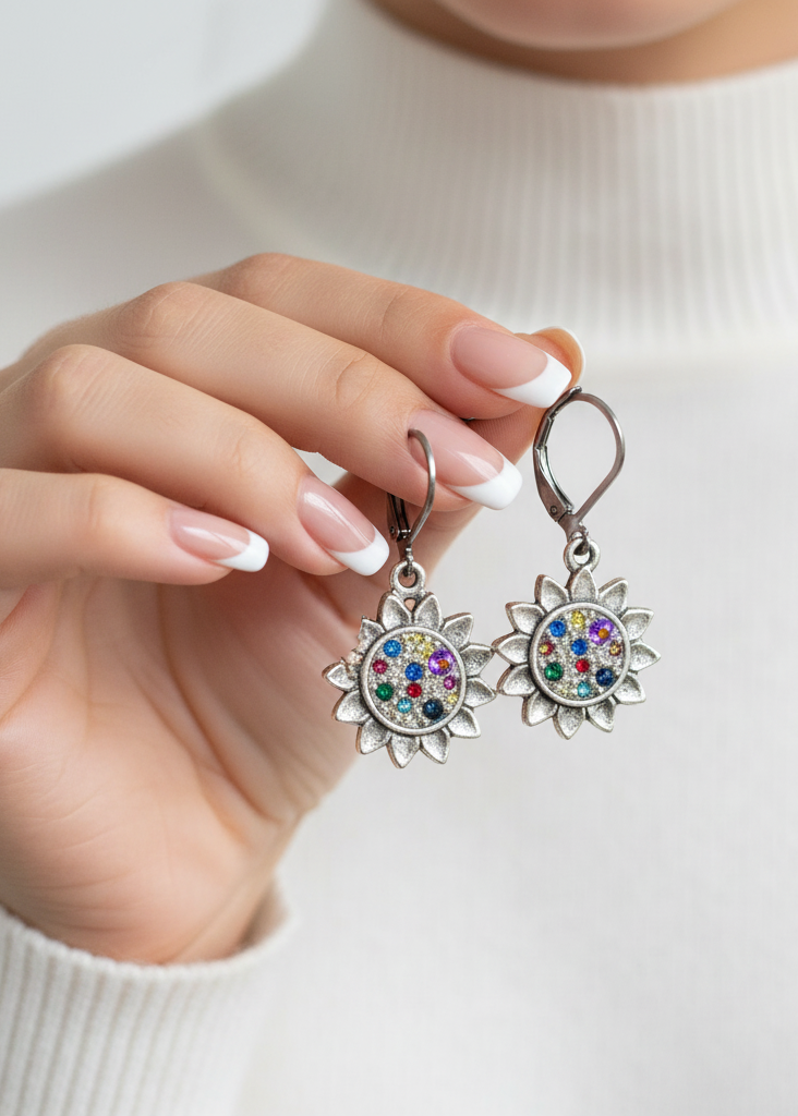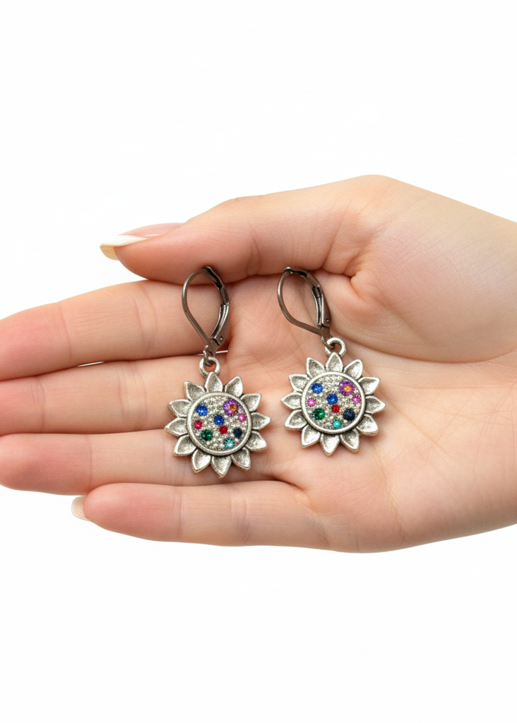 Celestial shimmer radiates from these stunning, vibrant handmade floral mosaic earrings featuring sterling silver plate sunflower bezels filled with sparkling Swarovski crystals and micro-pearls in colorful rainbow pink, blue, teal, green, red, and silver tones. Each Swarovski crystal and micro-pearl is meticulously hand-beaded and hand-set to create iridescent shimmer, lustrous sparkle that catches the light beautifully from every angle. This elegant, sophisticated, classy, stylish, chic flower sunflower design blends playful, fun, romantic charm with girly, feminine Victorian vintage appeal—perfect for the woman who loves dramatic, luxury premium fine jewelry with whimsical artistic celestial elegance.