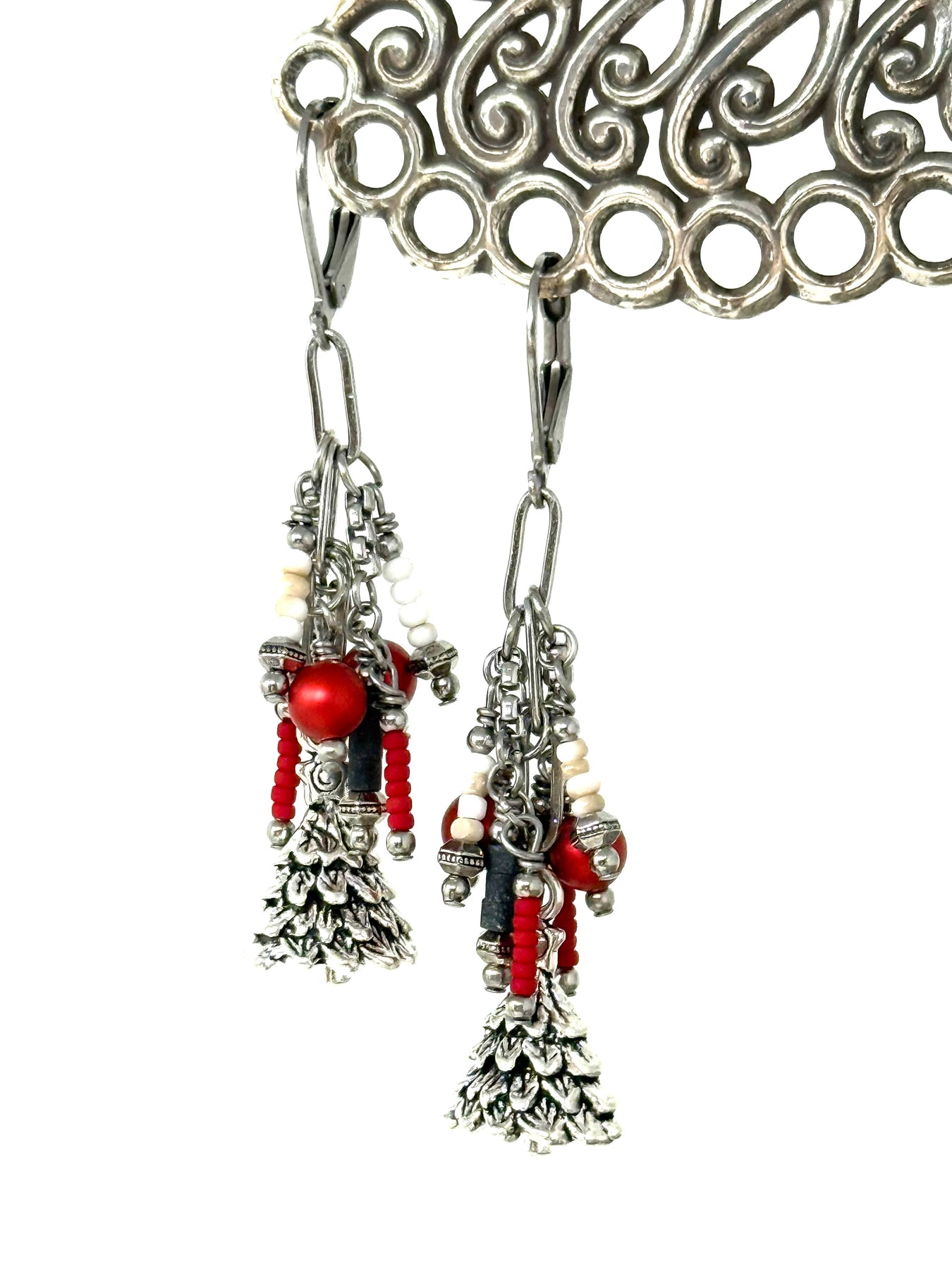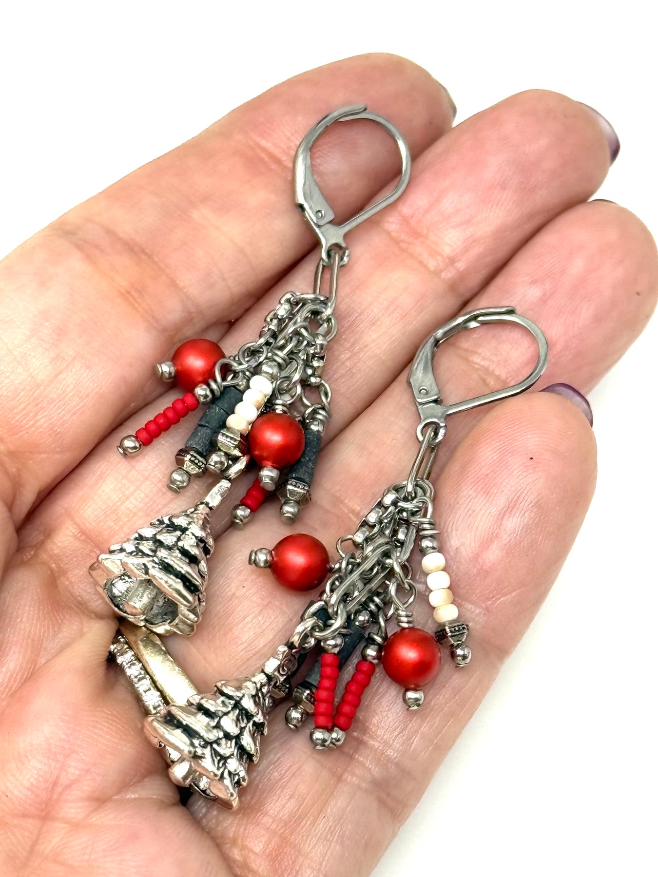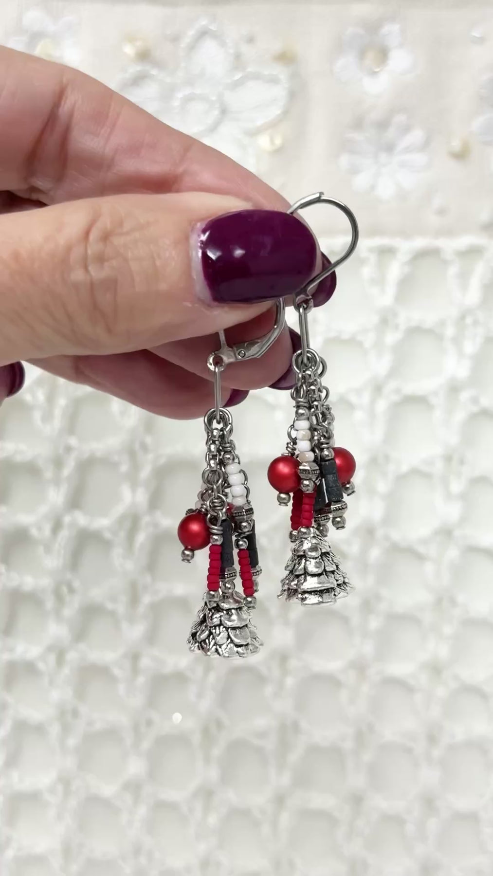 "These Christmas tree earrings are absolutely stunning! The red and white pearls and crystals dangle so beautifully, and they sparkle like ornaments on a tree. They're surprisingly lightweight and perfect for holiday parties and gatherings!"