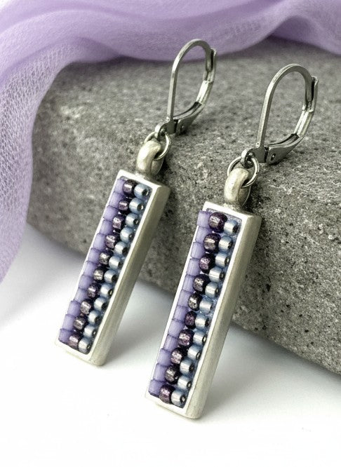 Purple and Silver glass shimmer rectangle dangle earrings.
