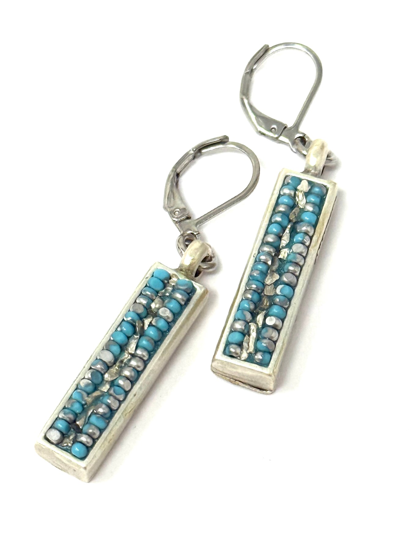 Handmade Hand-Beaded Mosaic Turquoise Blue Shimmer Earrings #2703E
