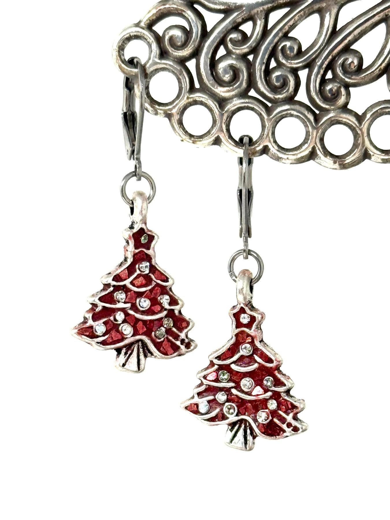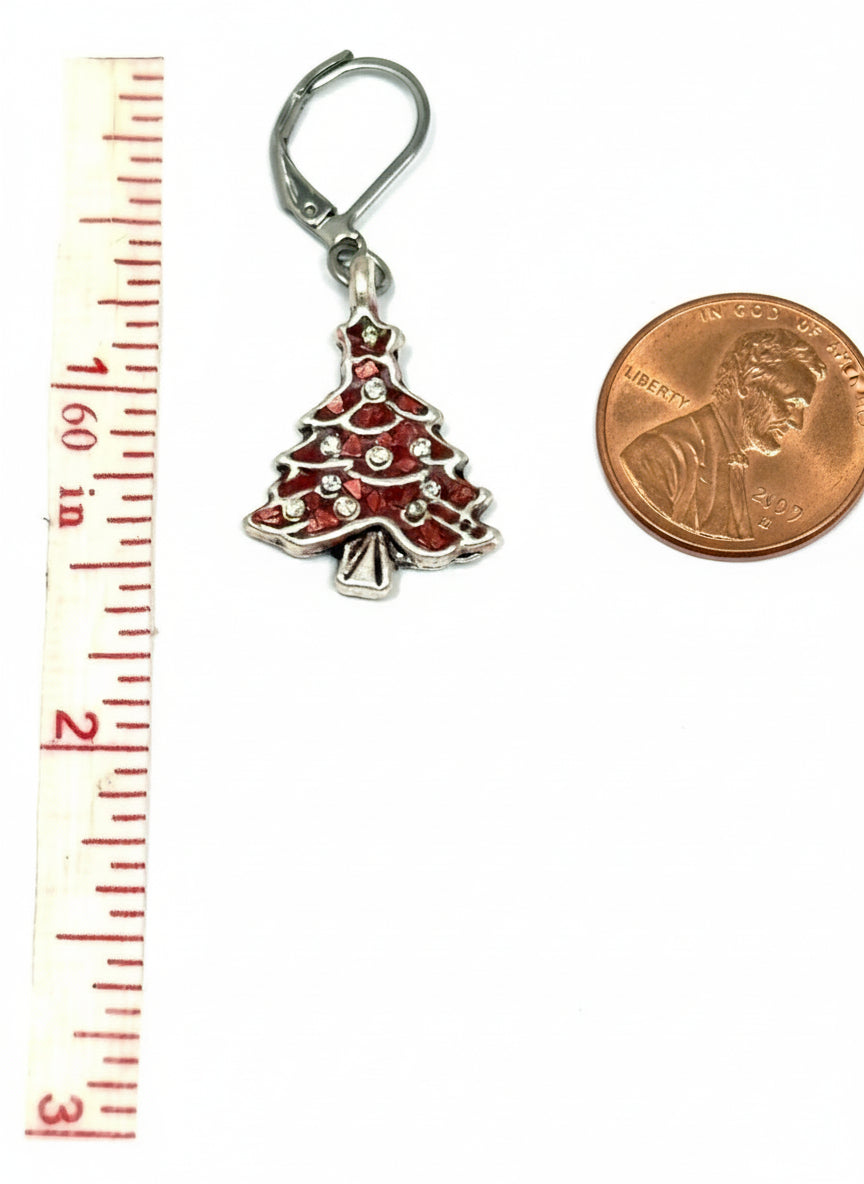 Red Christmas tree earrings displaying dimensional pewter tree bead, Apoxie setting depth, stainless steel leverback closure, and crystal sparkle