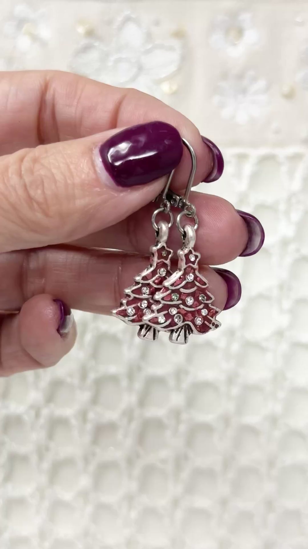 "These little Christmas tree earrings are absolutely adorable! The pewter trees have such nice detail, and the red Apoxie setting makes them pop. The tiny Swarovski crystals add just the right amount of sparkle. They're so lightweight I forget I'm wearing them, and I get compliments every time I wear them to holiday events!"