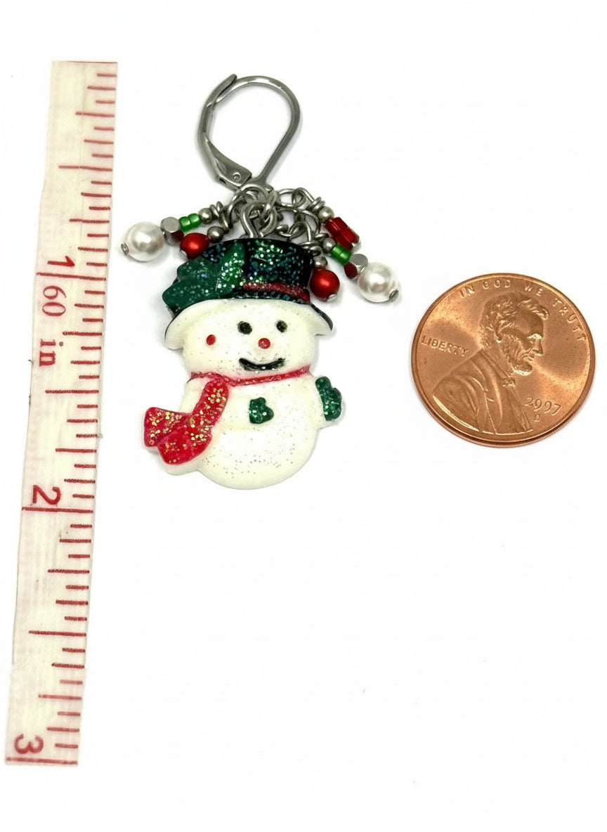 An exquisite showcase of handcrafted artistry, these adorable Handmade Snowman Pearl Beaded Dangle Earrings are festive works of wearable art. Each earring features a charming frosted shimmer snowman bead complemented by delicate red, green, and white pearls and glass shimmer seed beads that cascade above, adding texture and dimension.