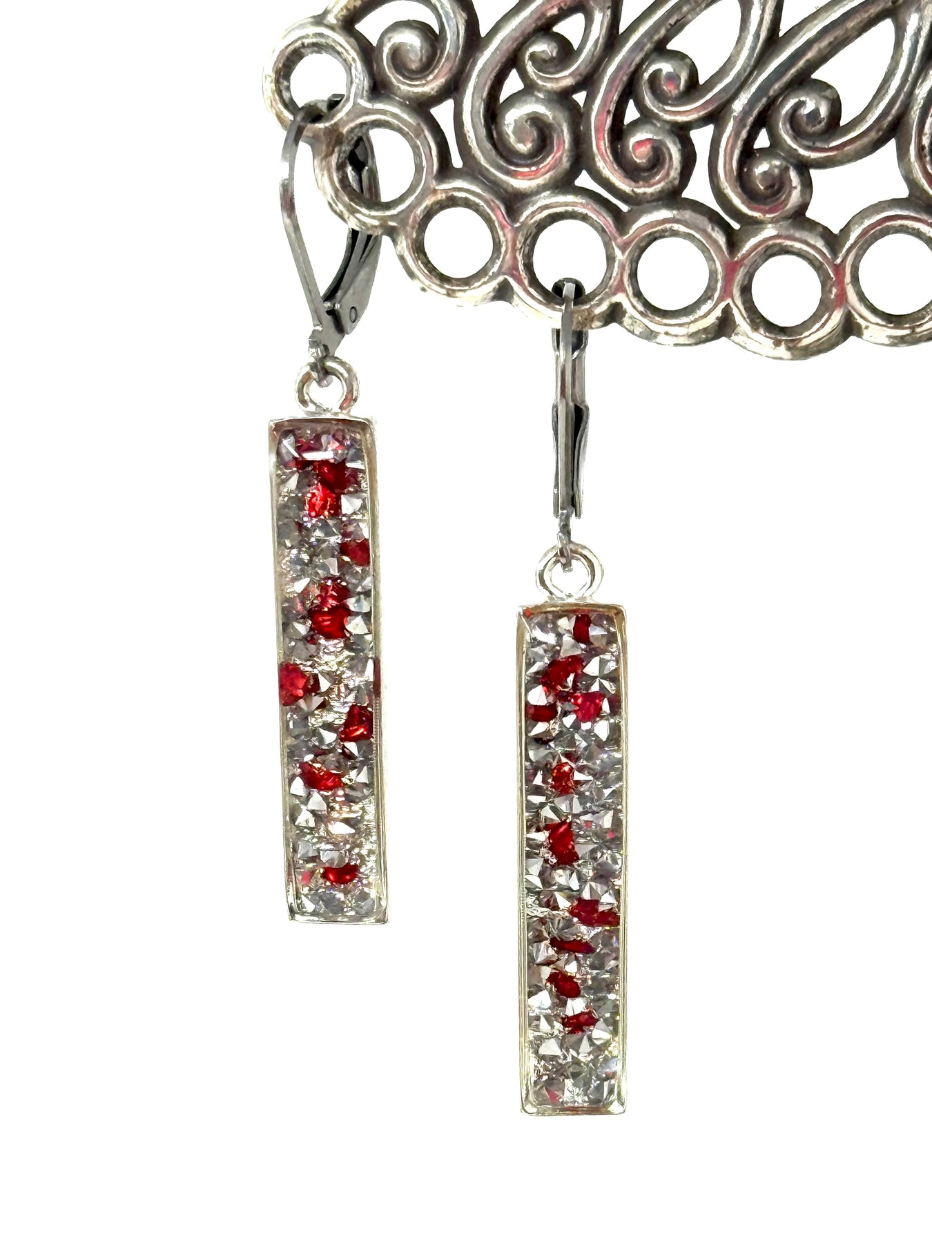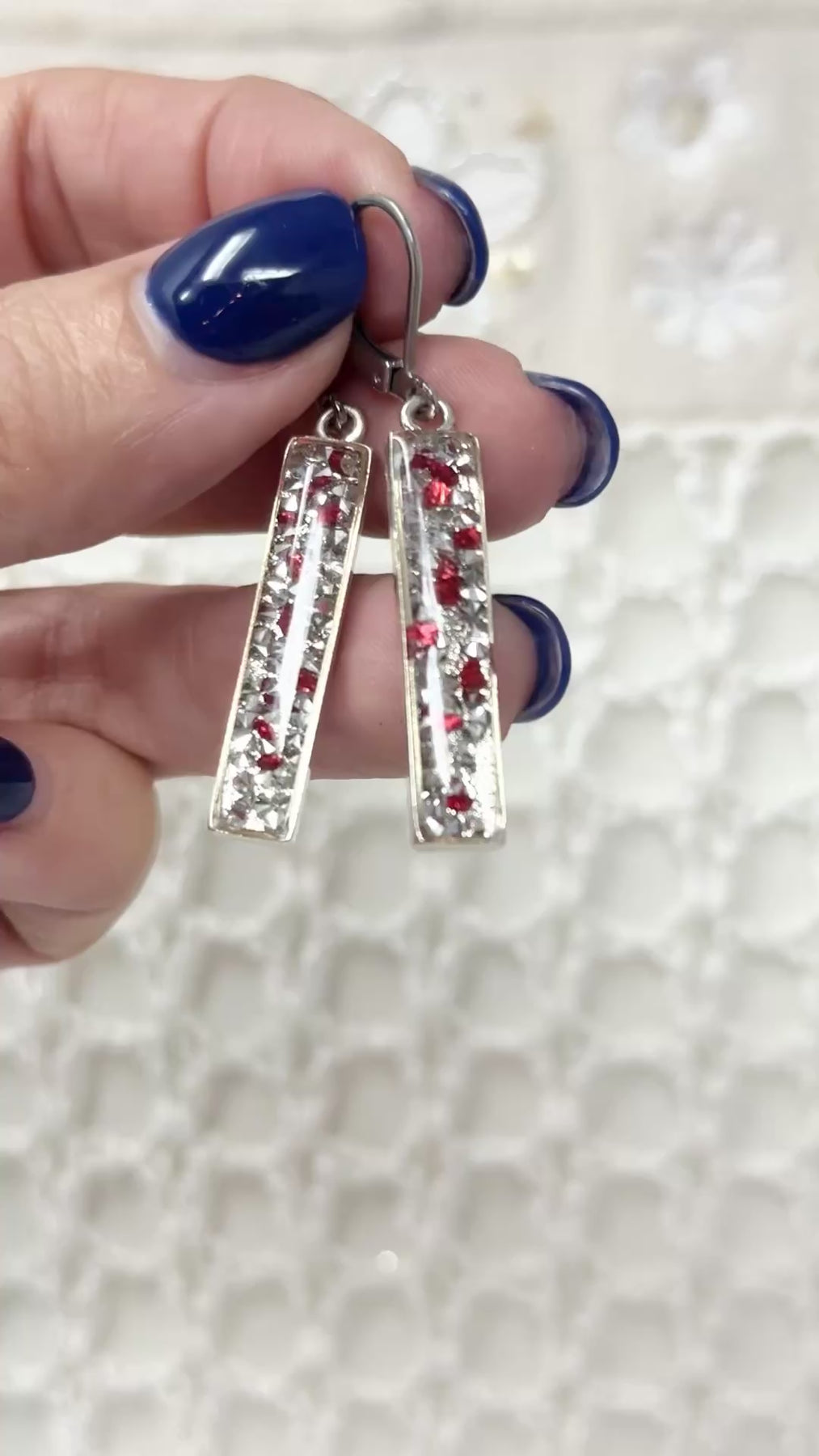 Design: Long dangle earrings featuring vintage frosted glass beads in festive silver and red tones
