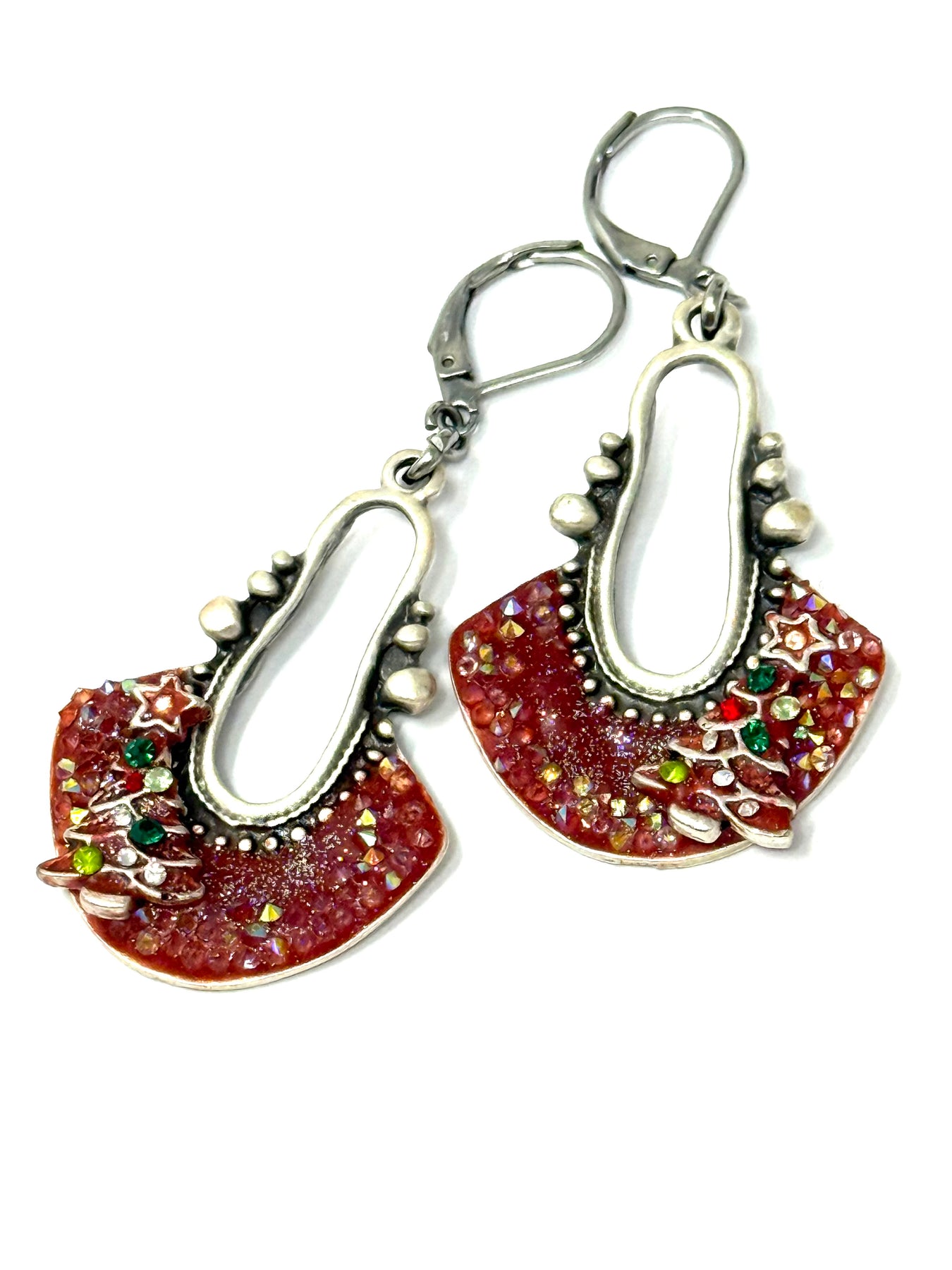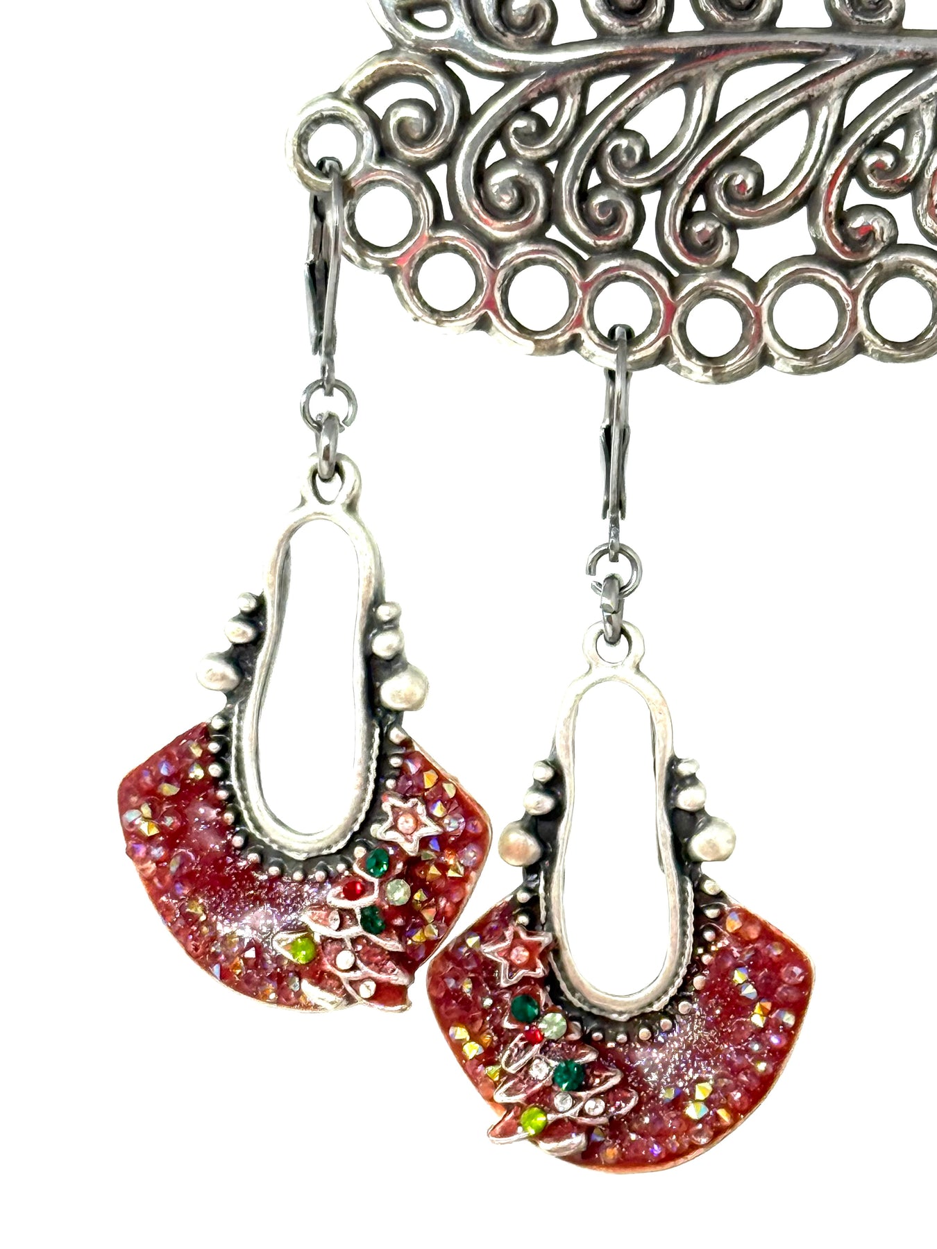 A true testament to fine craftsmanship, these stunning Christmas Tree Earrings are festive, sparkling works of wearable art. Each earring features a gorgeous red glitter Christmas tree embedded with tiny gold, green, and red stars and crystals complemented by an ornate antique pewter frame that adds vintage elegance and dimension.