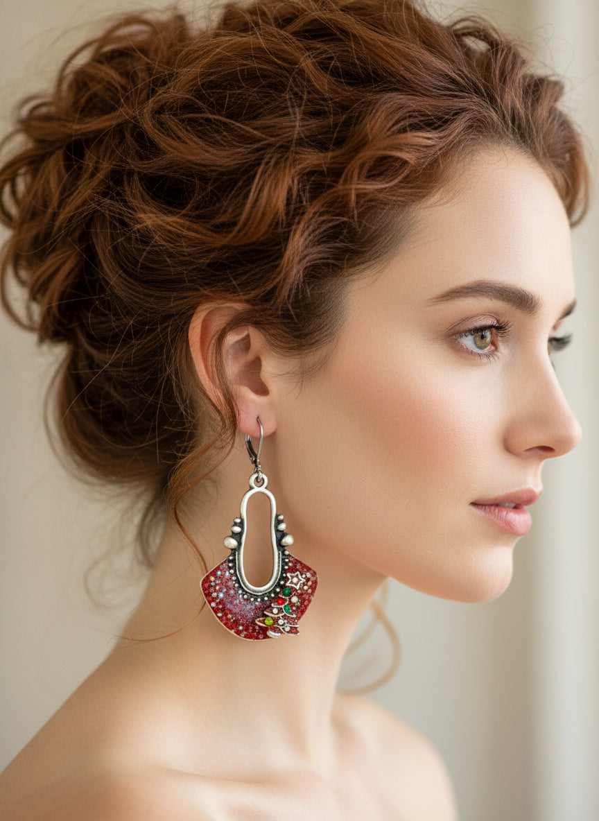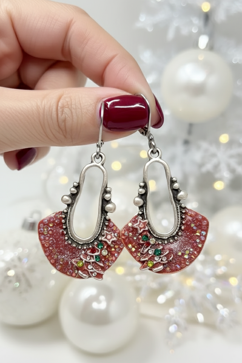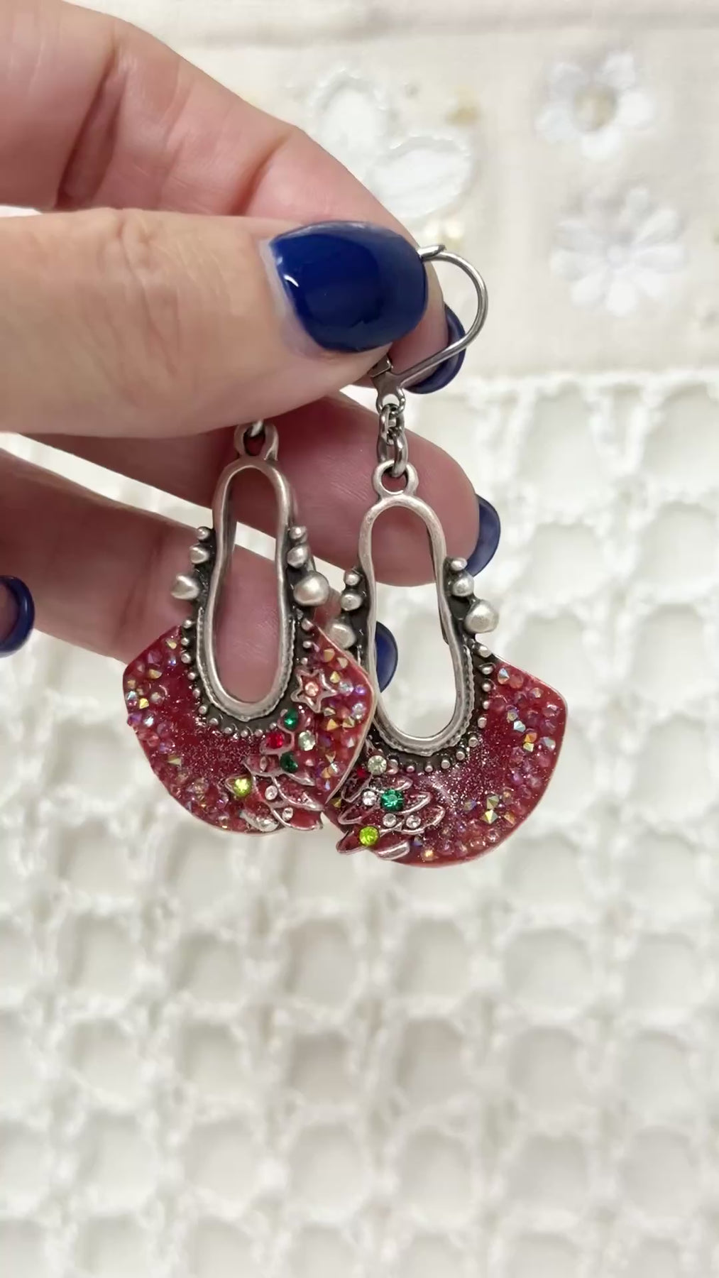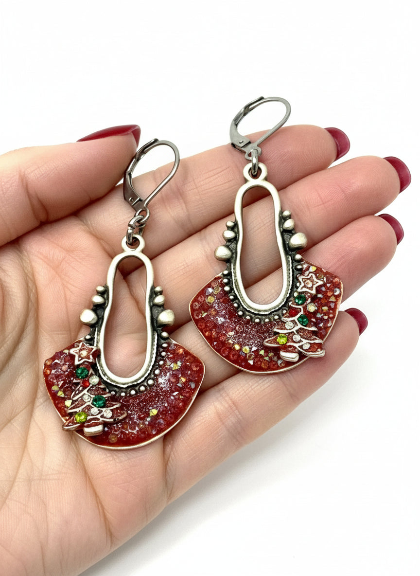"These Christmas tree earrings are absolutely stunning! The red glitter trees with all the tiny embedded stars and crystals are so eye-catching, and the pewter frames give them such an elegant, vintage feel. They're surprisingly lightweight for how substantial they look. I wear them throughout the entire holiday season - they're festive without being over-the-top!"