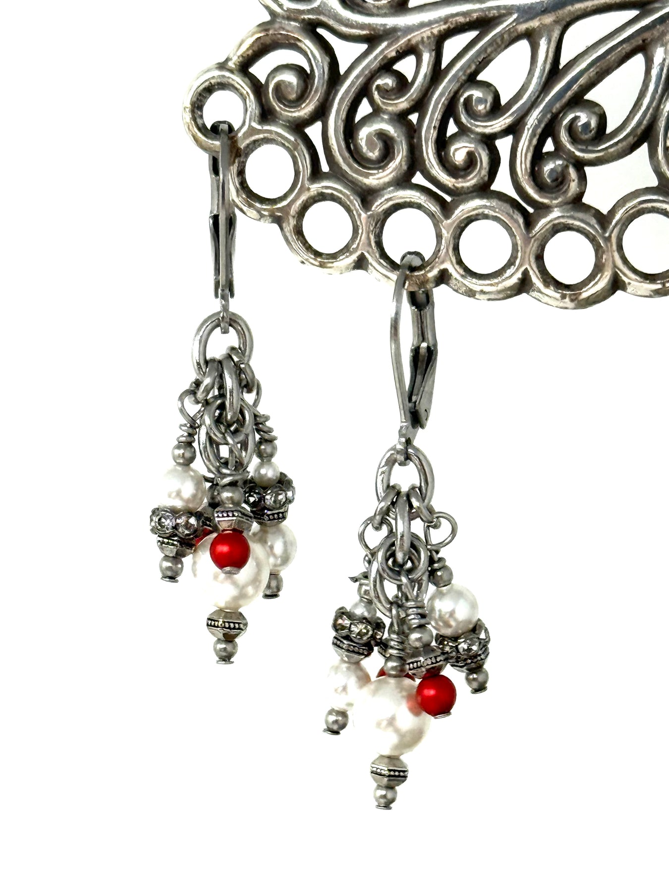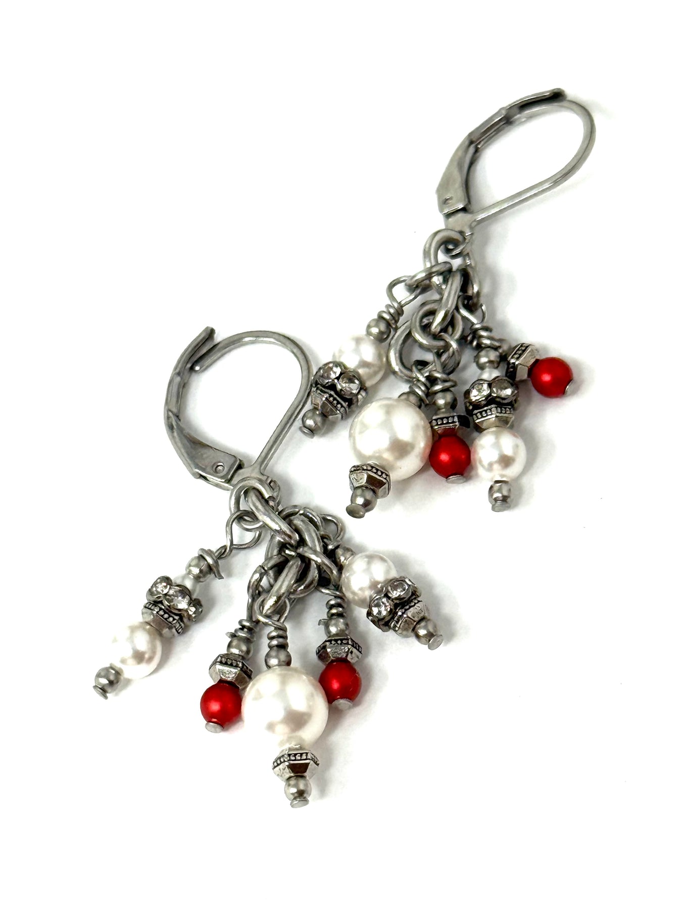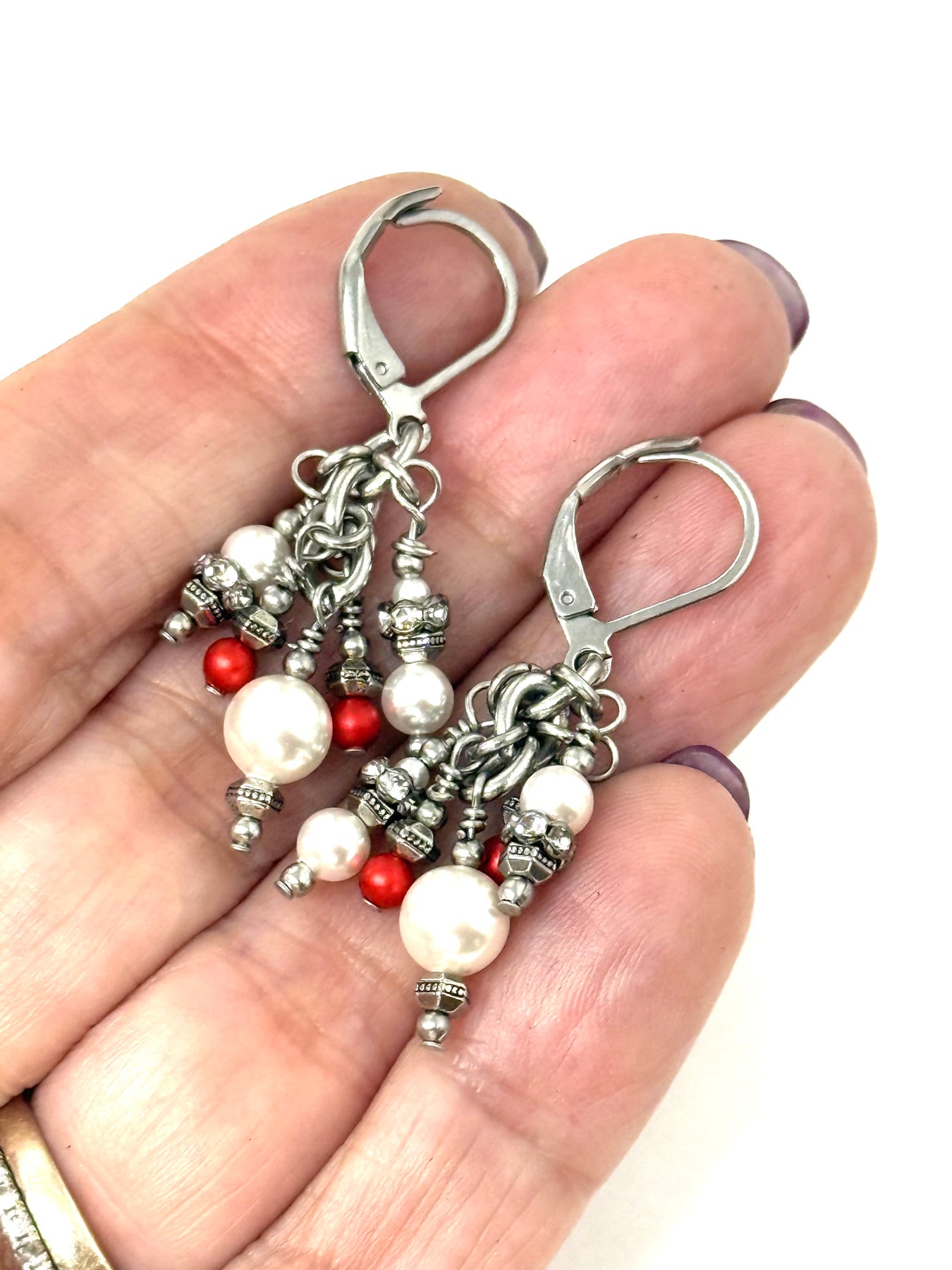 Red and White Swarovski Pearl Beaded Dangle Earrings