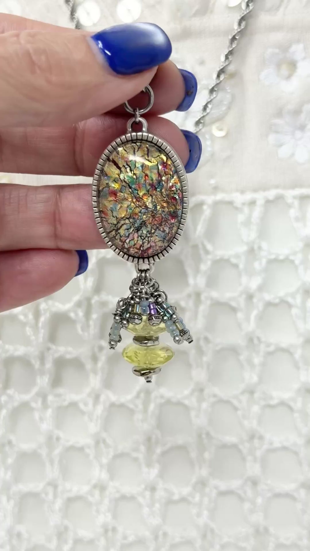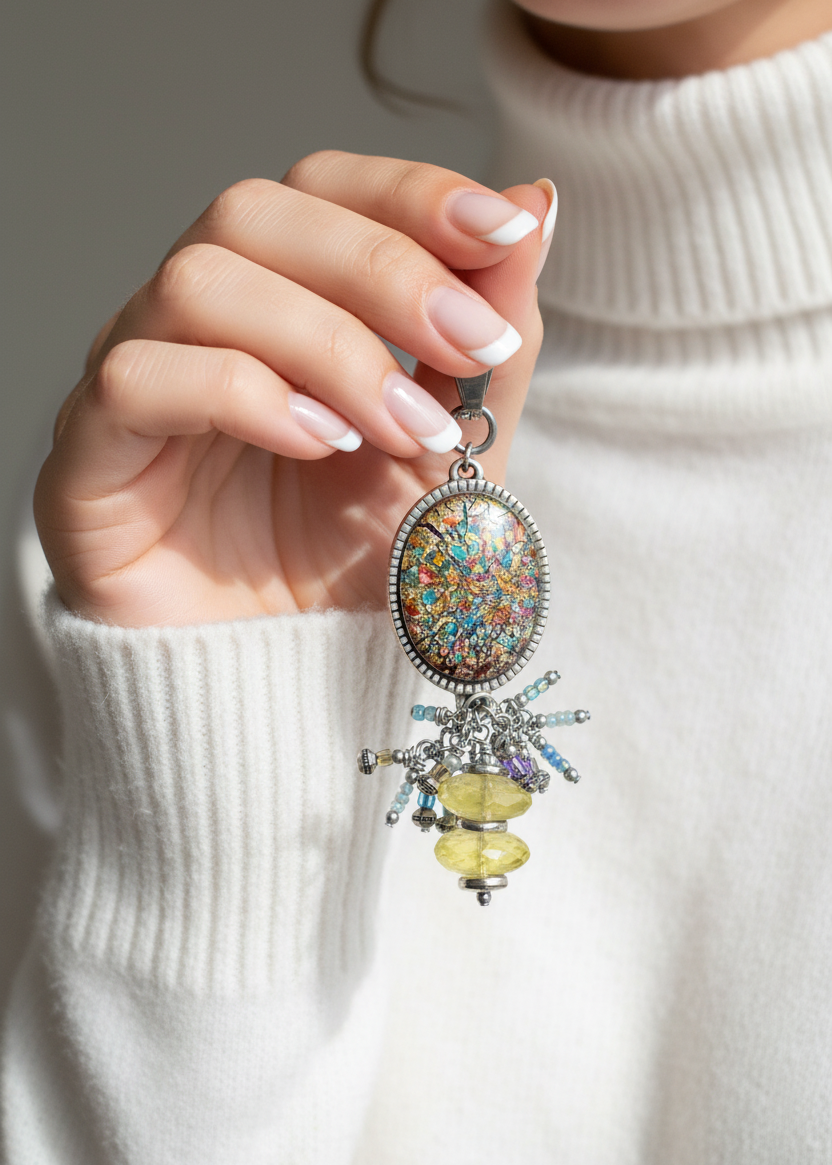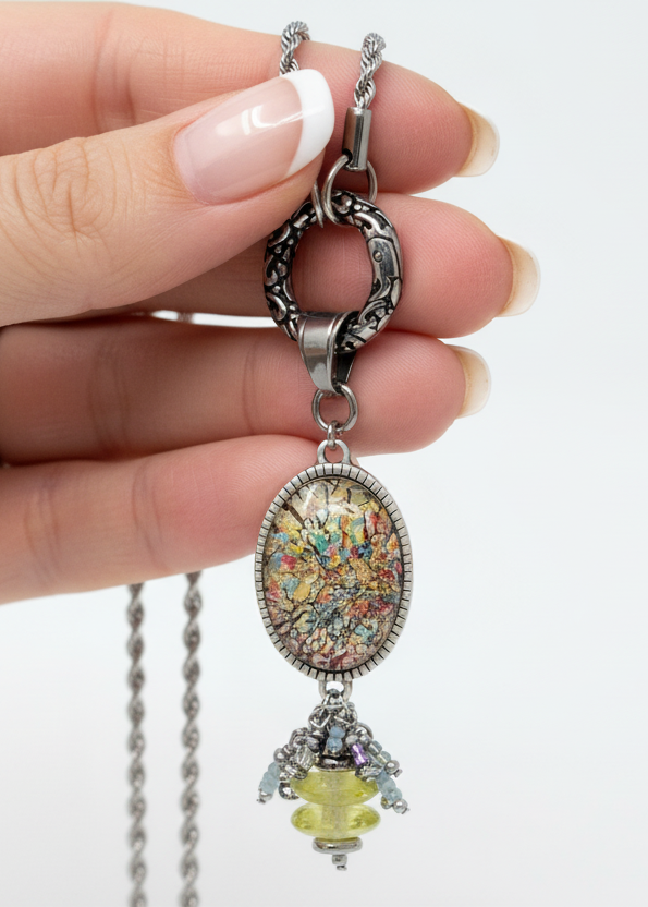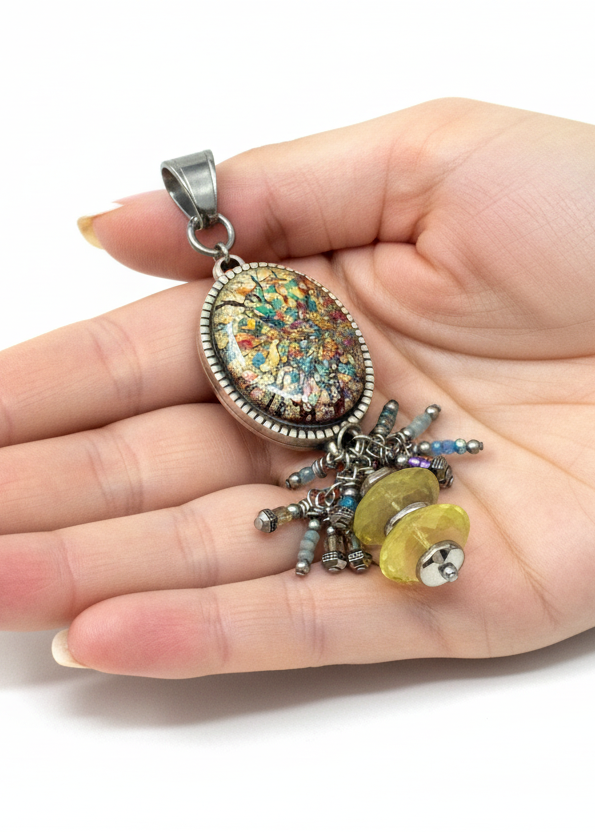 The pendant features a cascading cluster accented with citrine gemstone beads, charlotte cut glass seed beads, and rhodium-plated beads in silver, yellow, and teal tones — adding sparkle, shimmer, and lustrous dimension to every movement. This elegant, romantic pendant is as classy as it is artistic, with a sophisticated Victorian oval design that feels both spring-fresh and summer-bright — a stunning, feminine piece built with meticulous care.