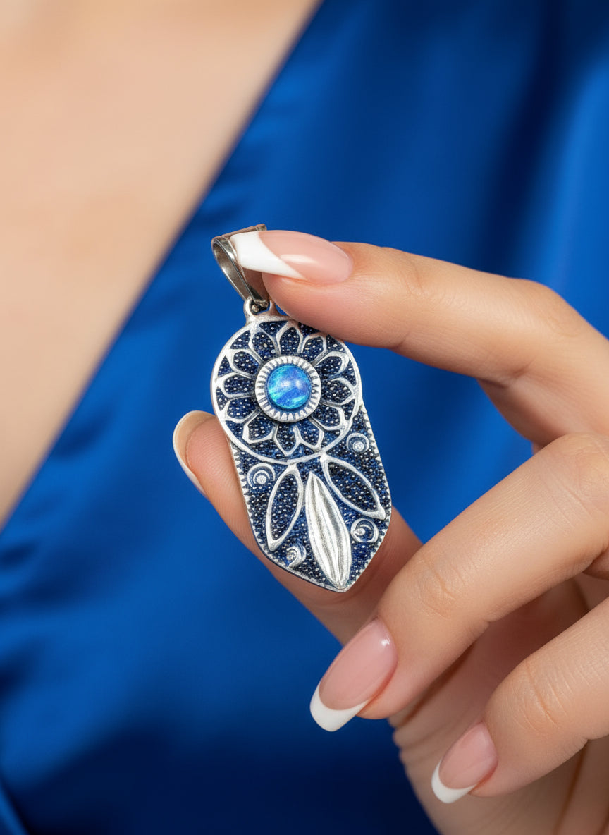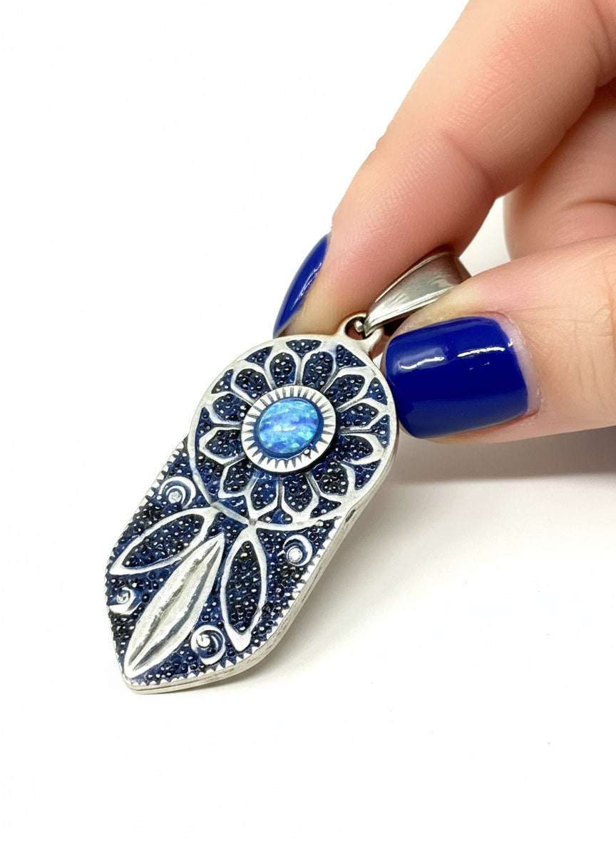 Close-up of blue floral daisy pendant showing silver floral design with tiny pearls, crystals, and glass beads - handmade in the USA