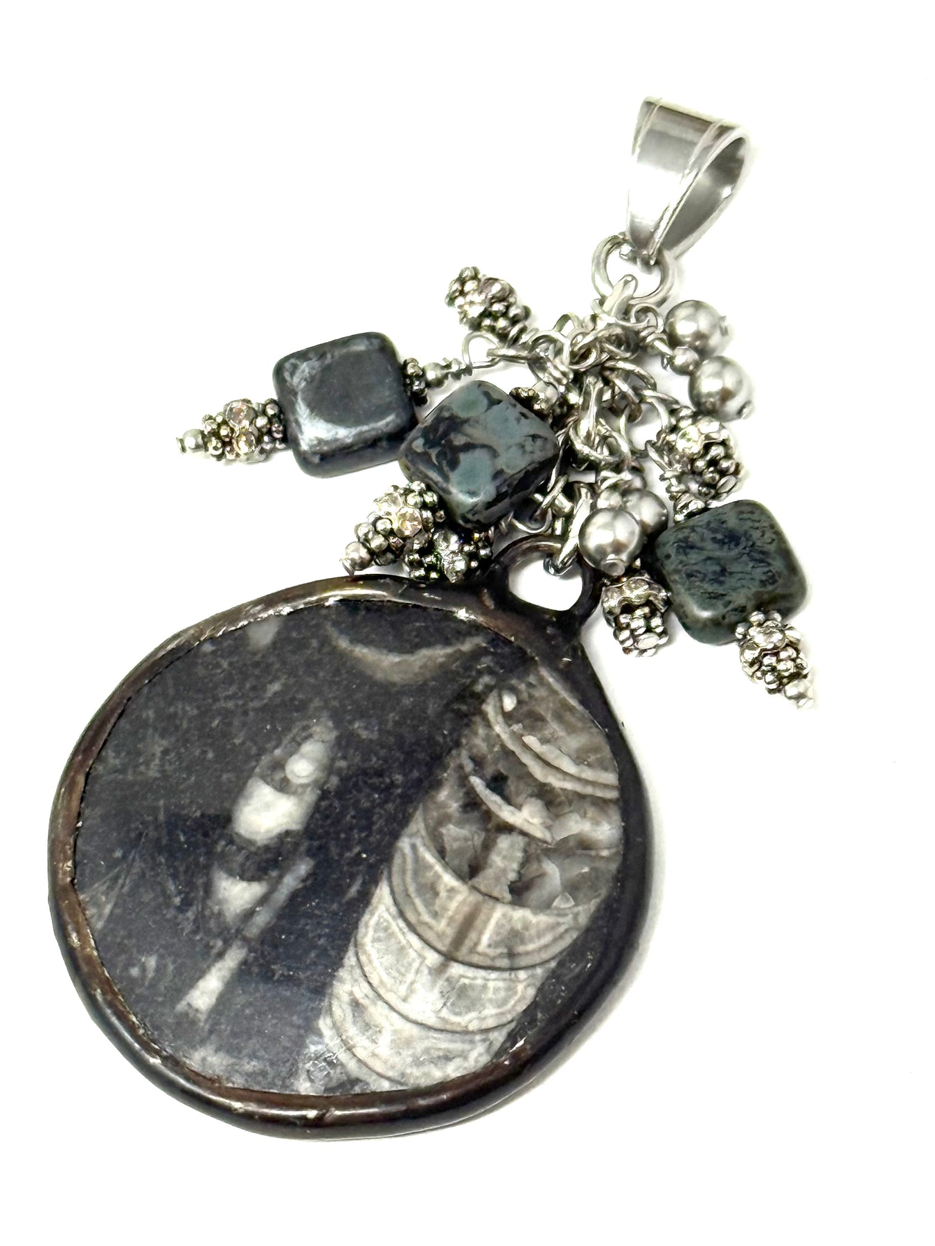 Dancing above the soldered agate focal is an artfully arranged cluster of Czech glass square beads in smoky charcoal tones, lustrous Swarovski pearls, and decorative silver-tone accents, creating rich texture and visual interest. Each component is meticulously hand-set to form the cascading design, with the Czech glass squares adding geometric contrast to the organic agate while the Swarovski pearls bring subtle luminosity. The monochromatic palette of blacks, grays, and silvers makes this pendant incredibly versatile - perfect for layering with other pieces, dressing up casual outfits, or adding edgy sophistication to evening wear.