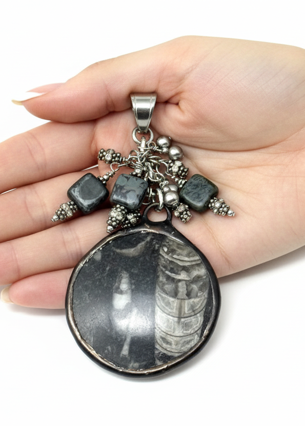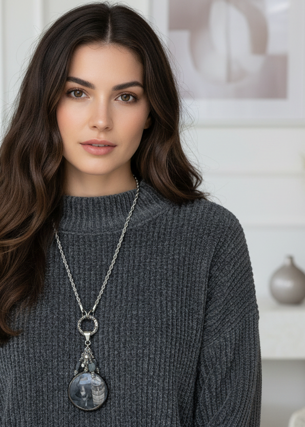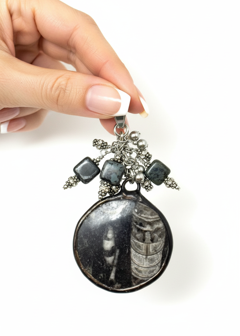 - Setting & Bezel: Silver-tone components and bail that complement the sophisticated black and gray color scheme