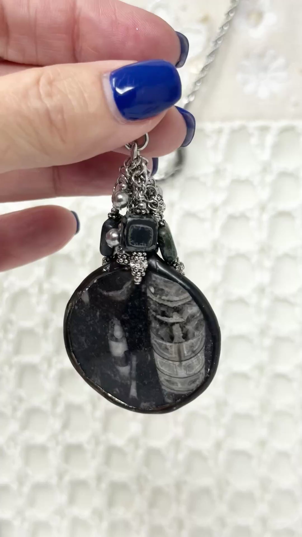 "I'm obsessed with this black agate pendant! The soldered focal bead has such incredible natural patterns - every time I look at it I notice something new in the gray and black banding. The Czech glass beads and pearls in the cluster add just the right amount of sparkle without being too flashy. It's become my go-to piece for everything from jeans and a tee to my favorite little black dress. The boho vibe is exactly what I was looking for, and knowing it's truly one-of-a-kind makes me love it even more!"