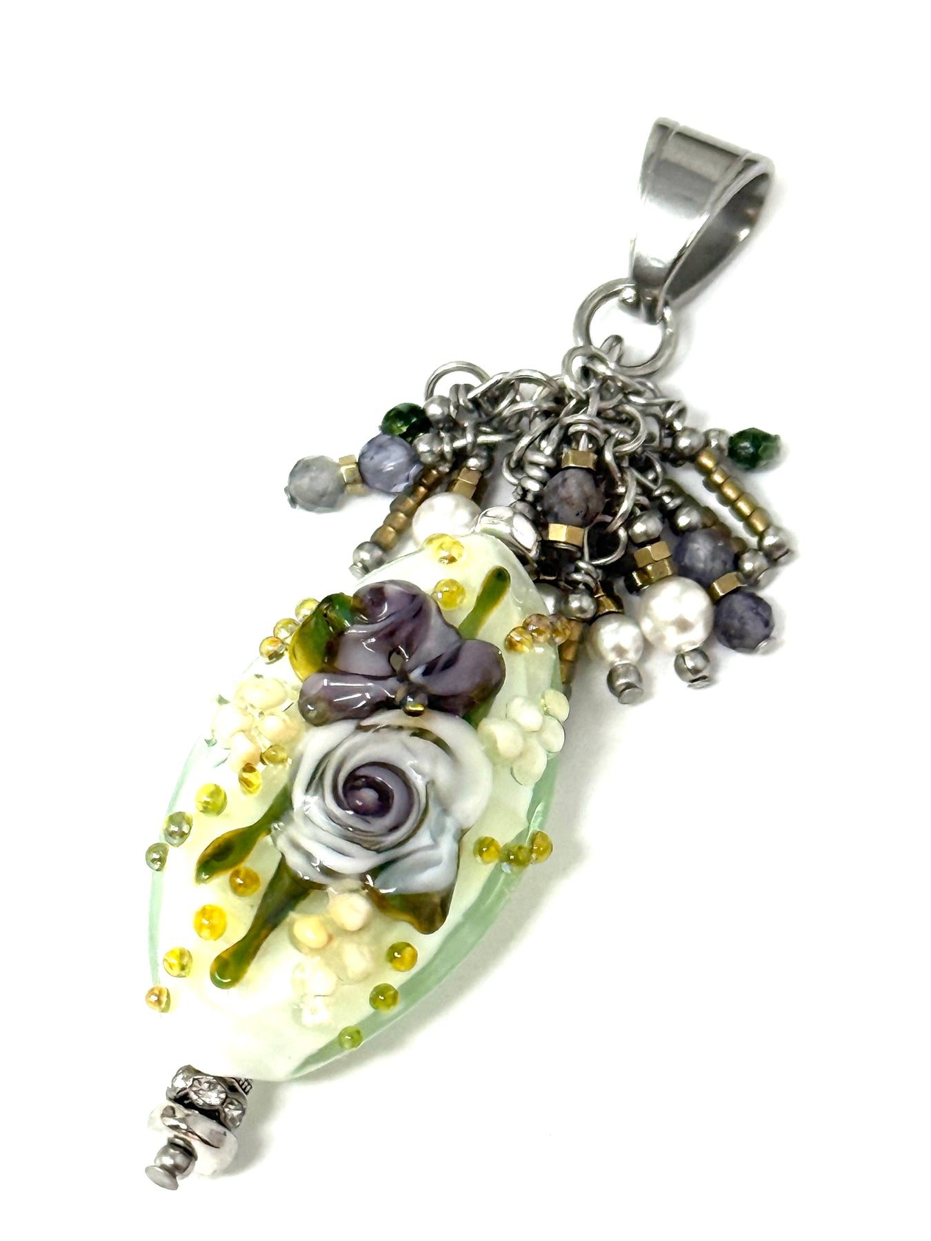 Elegant floral lampwork glass pendant with lavender roses worn as sophisticated statement necklace showcasing pale green and golden tones - artisan jewelry by Bead Dangle Design