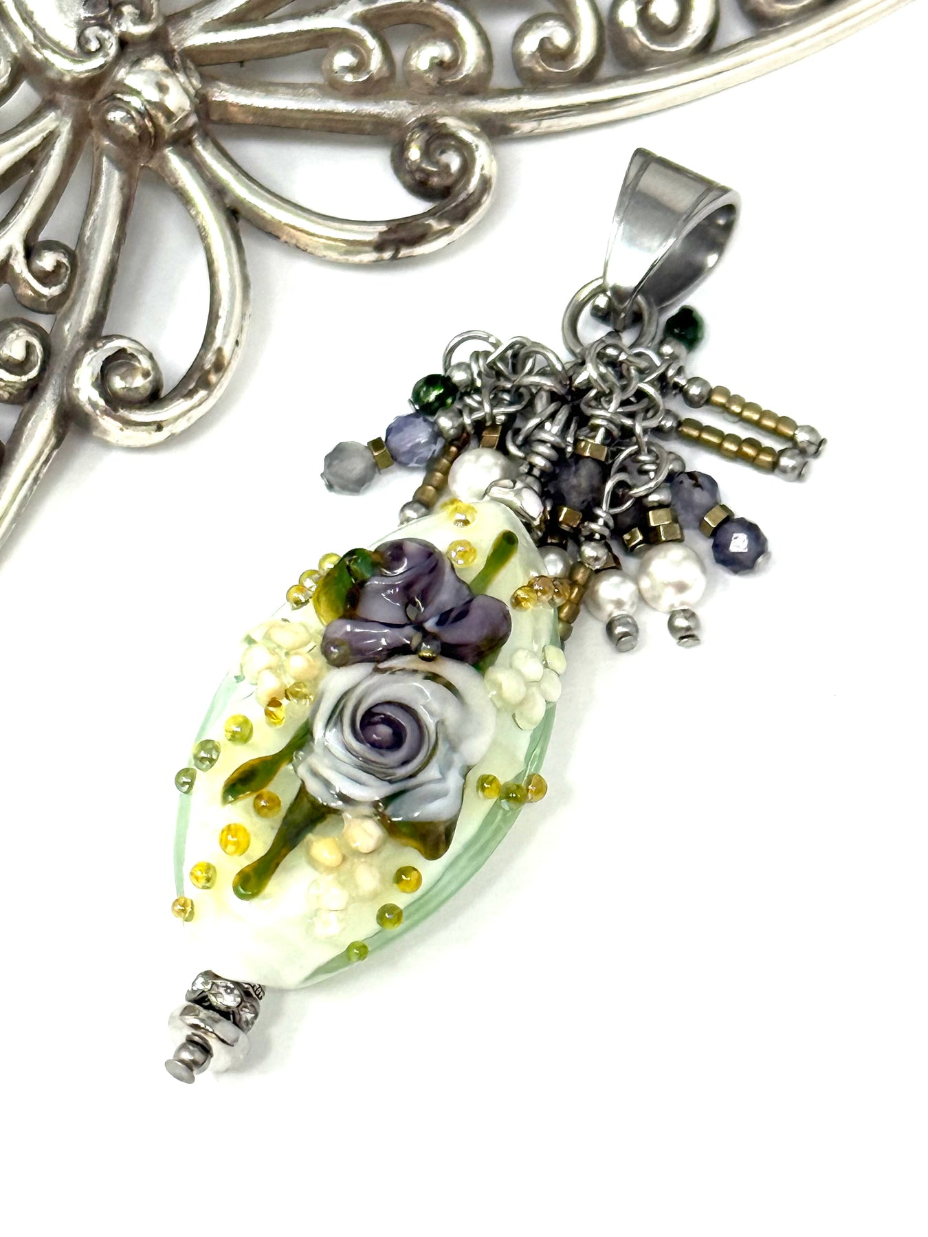 • Focal Bead: Features a stunning handmade lampwork glass bead with exquisite lavender and white roses with delicate petals against a dreamy background of soft pale green leaves, creamy off-white, and golden brown accents