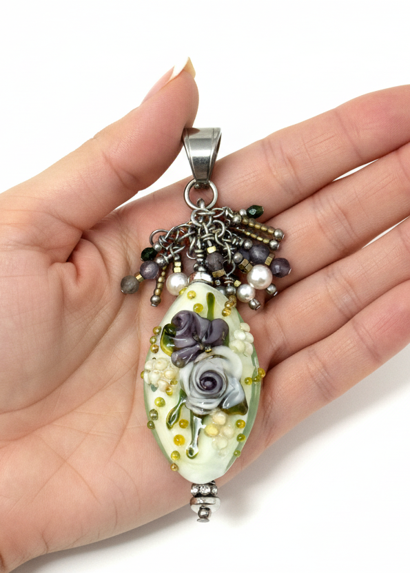 Floral lampwork glass pendant with lavender roses resting in hand showcasing meticulous beadwork detail with iolite gemstones and Swarovski pearls - one-of-a-kind artisan jewelry by Bead Dangle Design