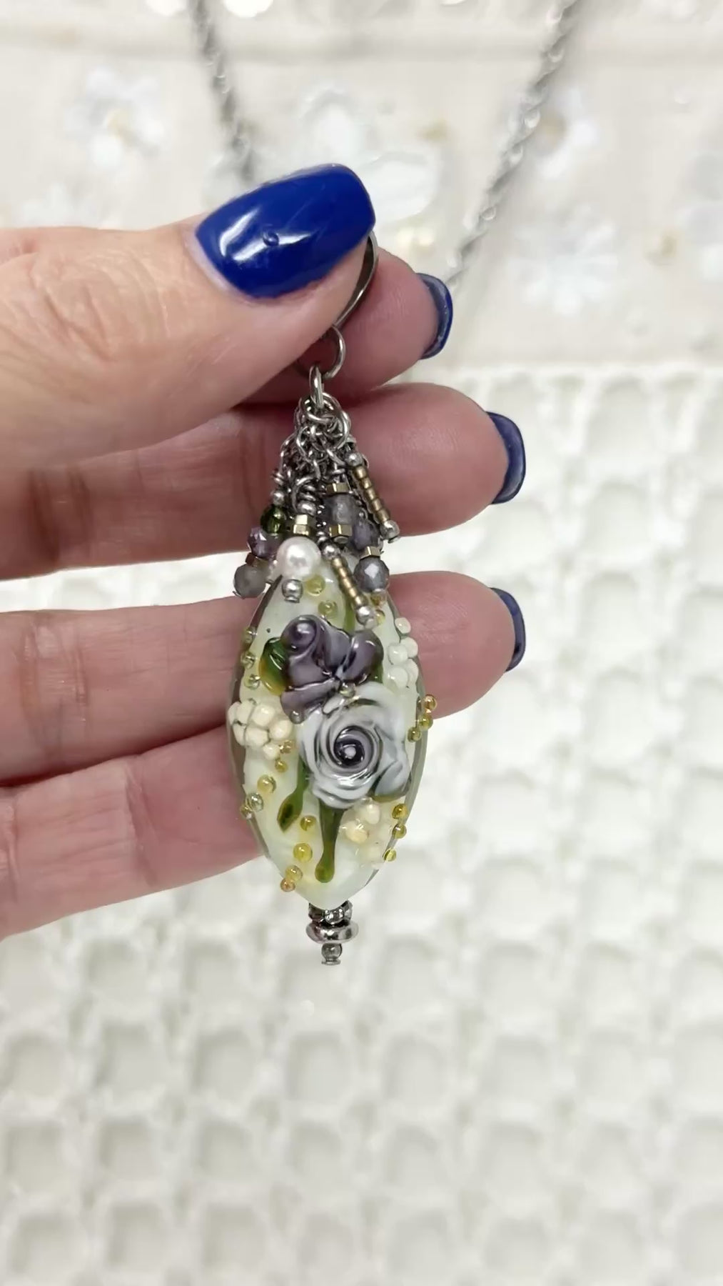 Video showcasing elegant floral lampwork glass pendant with lavender roses, iolite gemstones, and Swarovski pearls rotating to show all angles and sparkle - handmade artisan jewelry by Bead Dangle Design