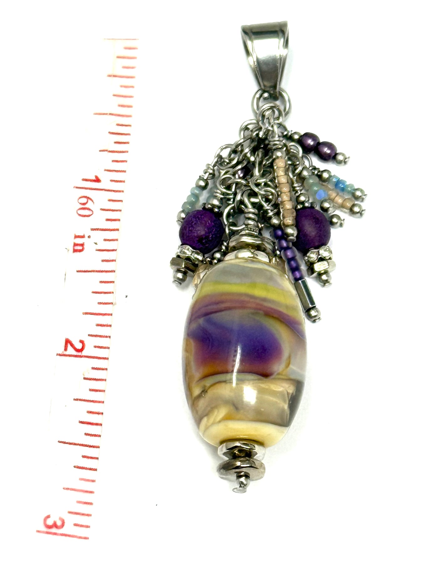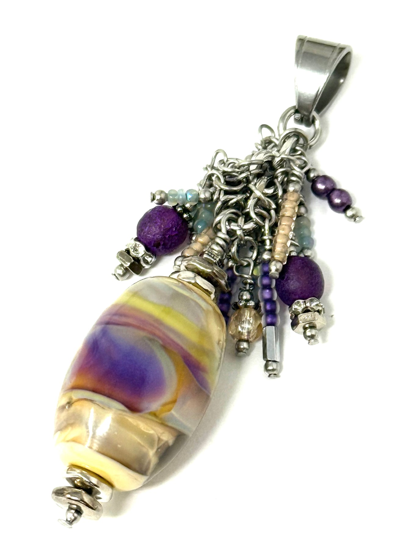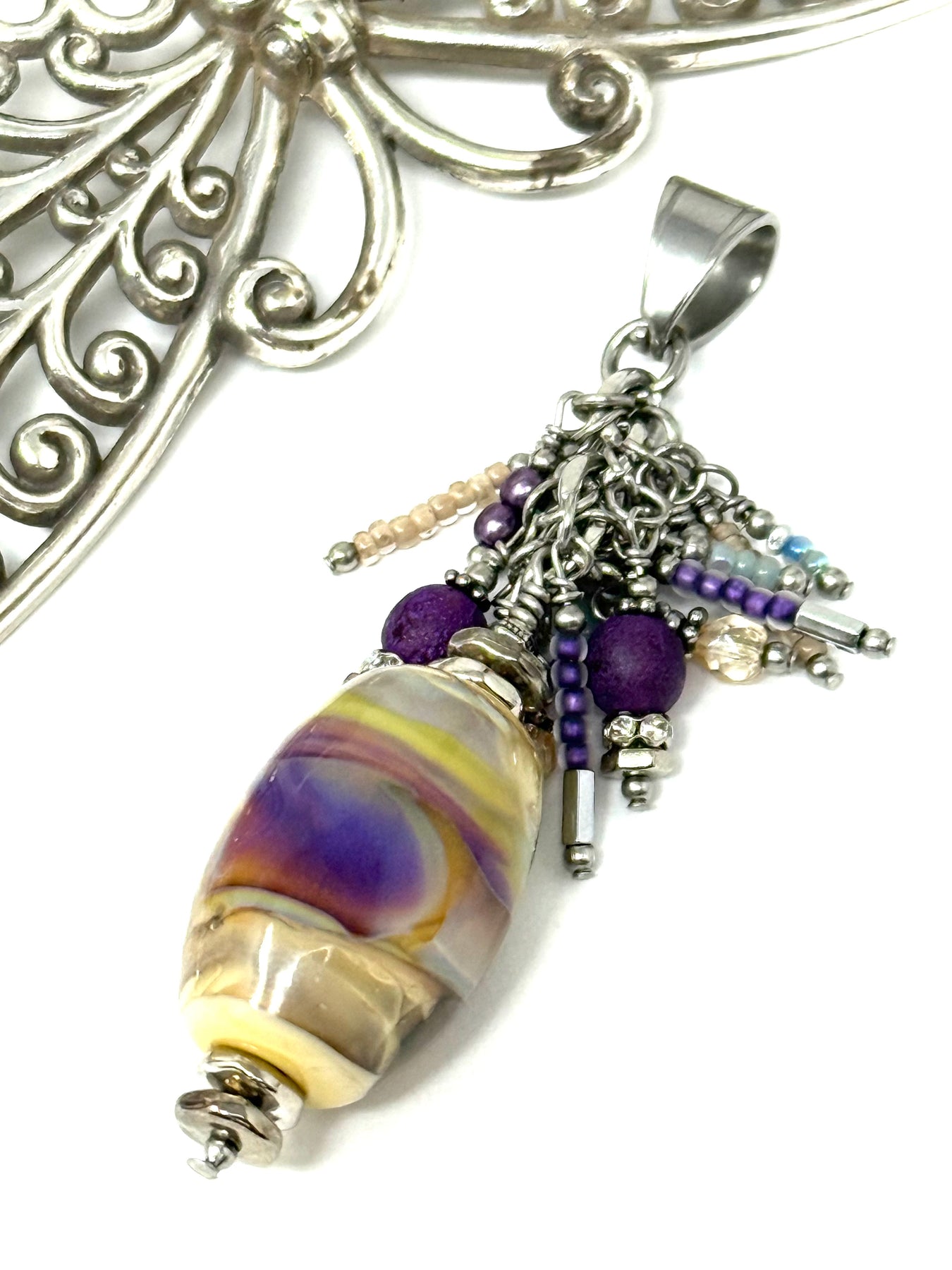 The pendant features an elegant beaded cluster crown in coordinating purple textured Czech glass beads, cream glass chateau seed beads, teal accents, and Czech faceted glass beads, beautifully complemented by oxidized pewter beads and decorative elements. Each bead is carefully hand-selected and hand-set to create a cohesive, sophisticated design that enhances the lampwork focal. The stainless steel bail ensures durability and a secure connection to your favorite chain. The elegant color palette and iridescent shimmer make this pendant perfect for special occasions, evening events, adding sophistication to professional attire, or elevating your everyday style with artisan elegance.