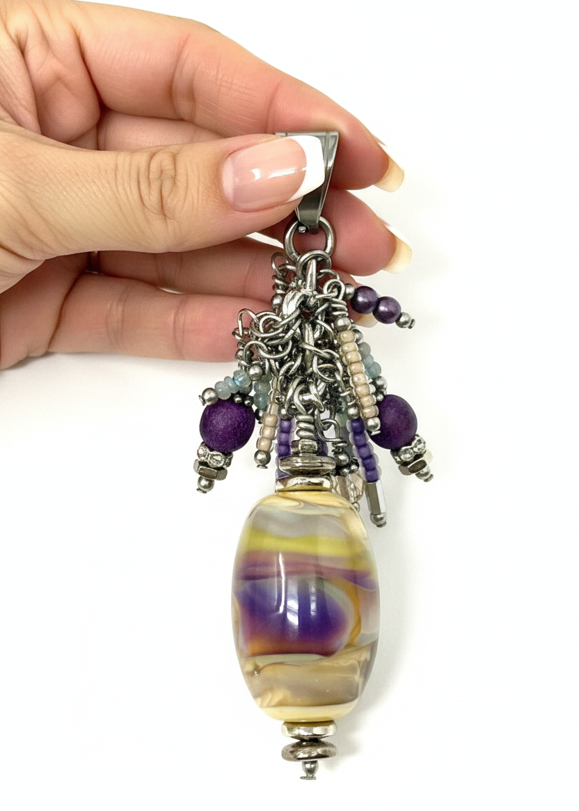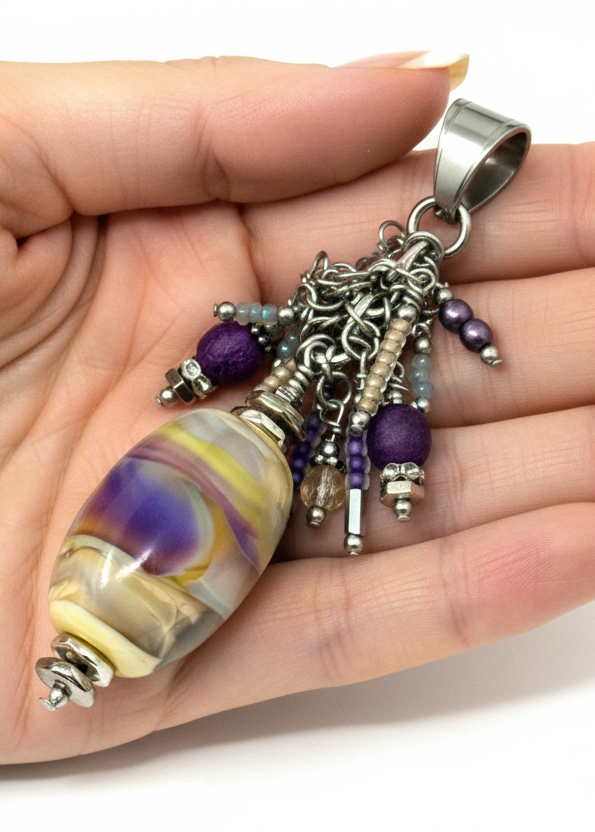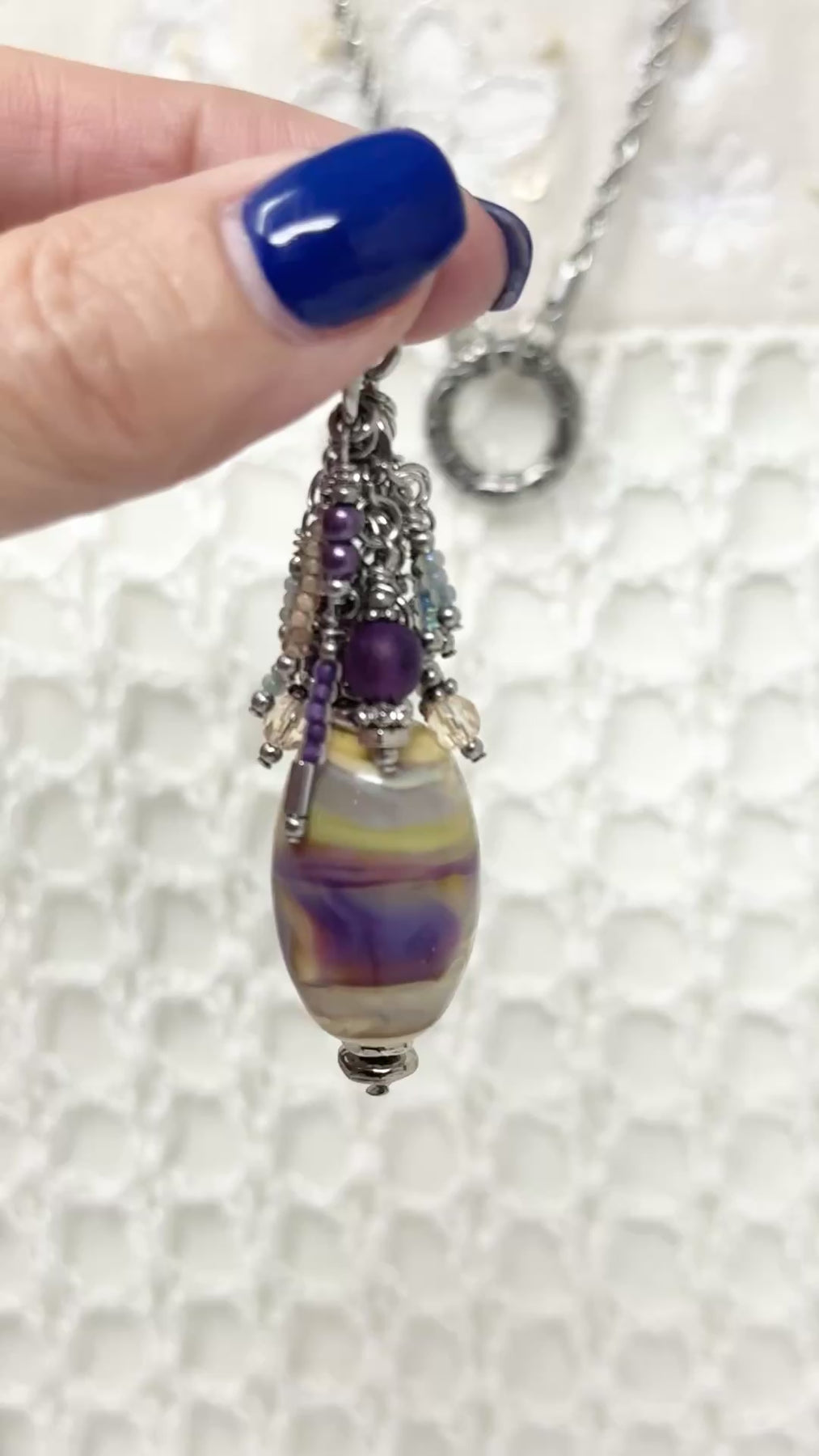 "This pendant is absolutely breathtaking! The iridescent lampwork glass catches the light in the most beautiful way, and the purple and teal colors are so rich and elegant. I love how the beaded cluster adds dimension and movement. People always ask where I got it, and they're amazed when I tell them it's one-of-a-kind. It's become my signature piece for special occasions!"