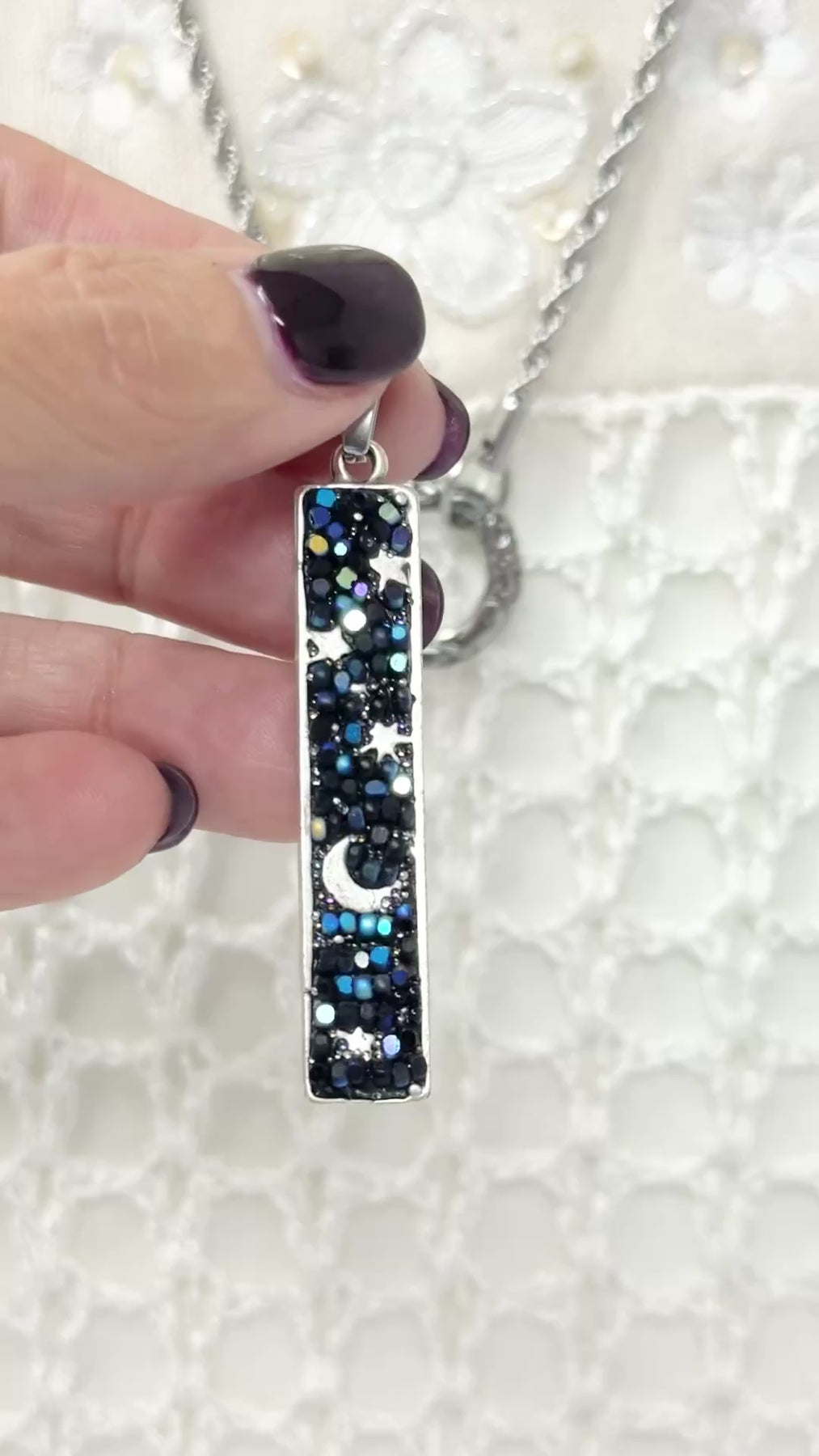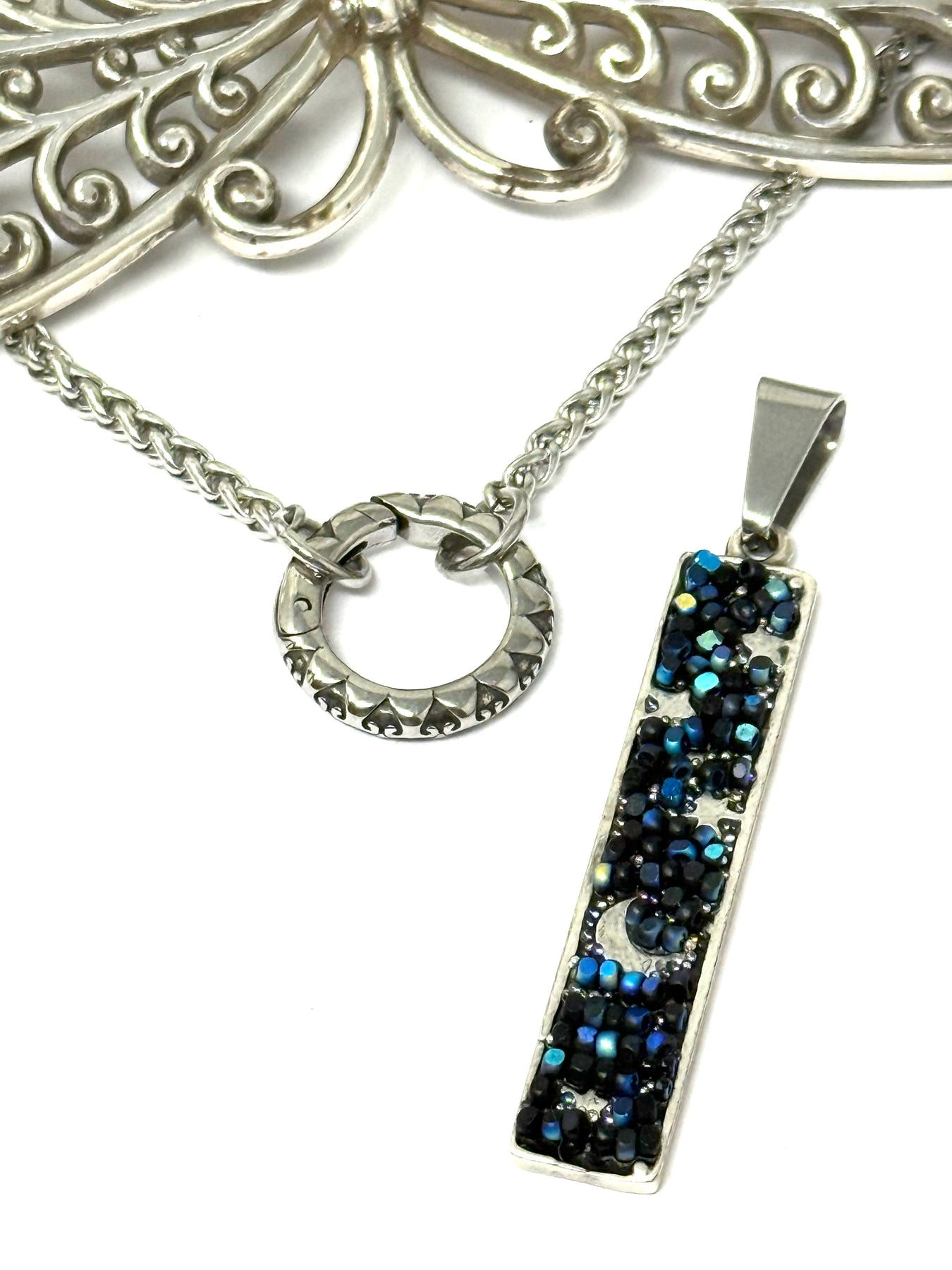 • Add this pretty Handmade Blue Glass Seed Bead Mosaic Star and Moon Pendant to your jewelry collection today.