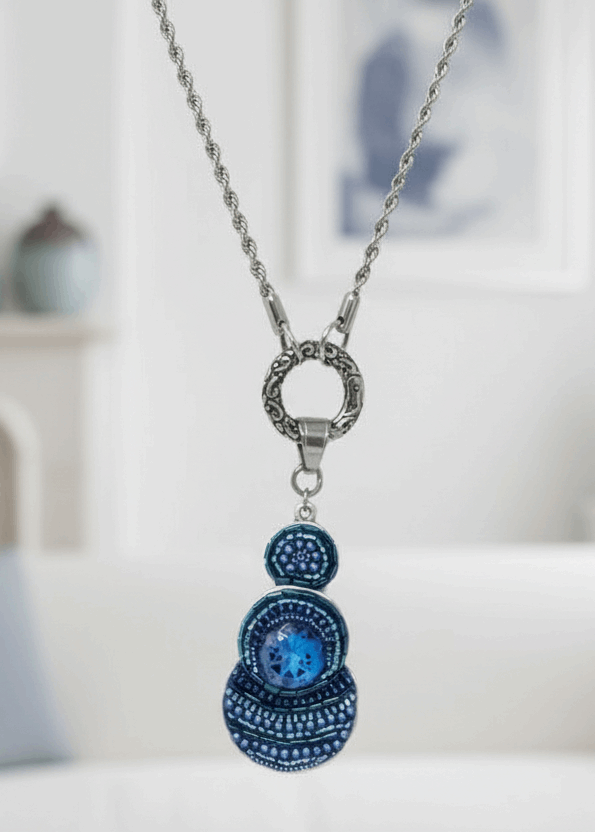 "This deep blue pendant is absolutely stunning! The three-circle stacked design with the seed bead mosaic is so intricate and elegant. The large faceted Austrian crystal has such incredible sparkle and the deep blue color is so rich and vibrant. The Swarovski pearls add such beautiful contrast. It's my go-to pendant when I want to make a statement—the quality and craftsmanship are outstanding!"