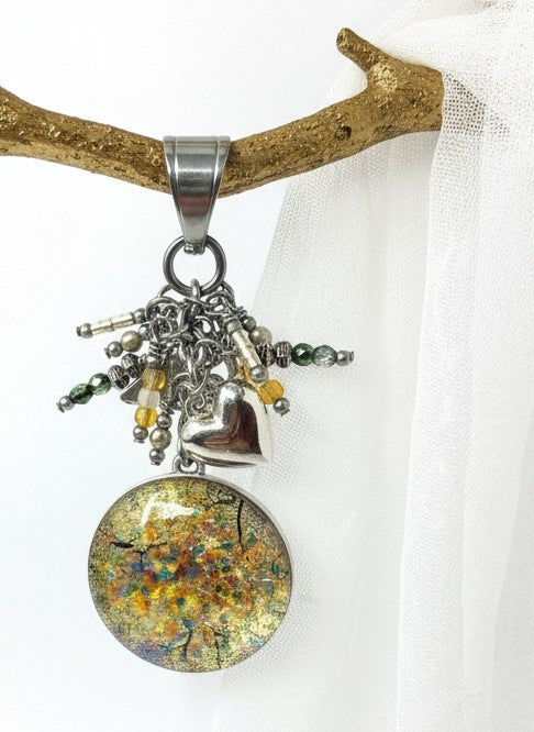 "This lightweight pendant is the perfect mix of composition and color. I love the shades of green and especially the bird. It looks great over my clothes and I'm glad to have it!"