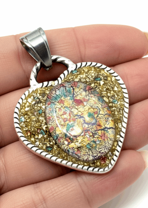 The pendant features coordinating colorful tones, accented with swarovski crystals and glass rocks. Each element is carefully hand-selected to complement the oxidized antique pewter heart bezel with opal art glass focal, creating a cohesive, eye-catching design. The stainless steel bail with large bail opening ensures durability and a secure connection to your favorite chain. The vibrant color palette and heart design make this versatile pendant perfect for romantic occasions, artistic gatherings, or adding sophisticated statement style to everyday wear.