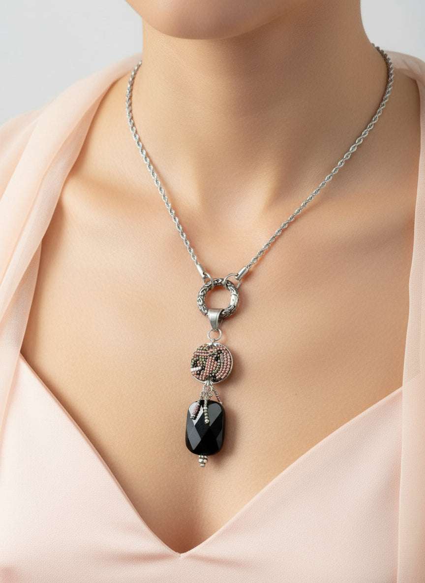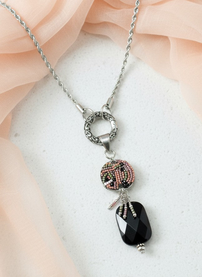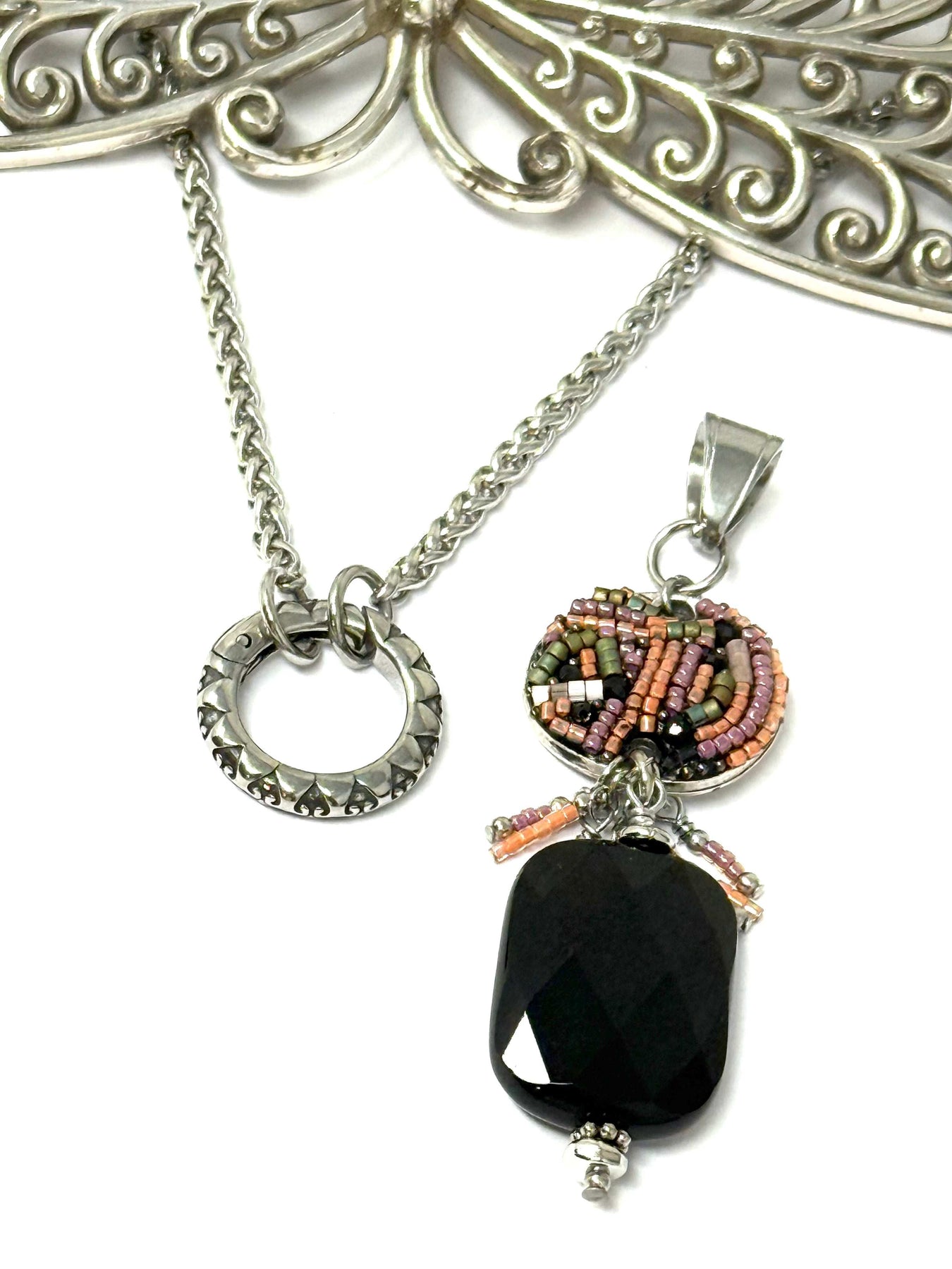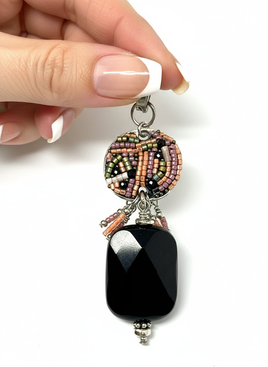 Black Onyx Pendant Necklace Mosaic - Handmade Beaded Jewelry #8262D