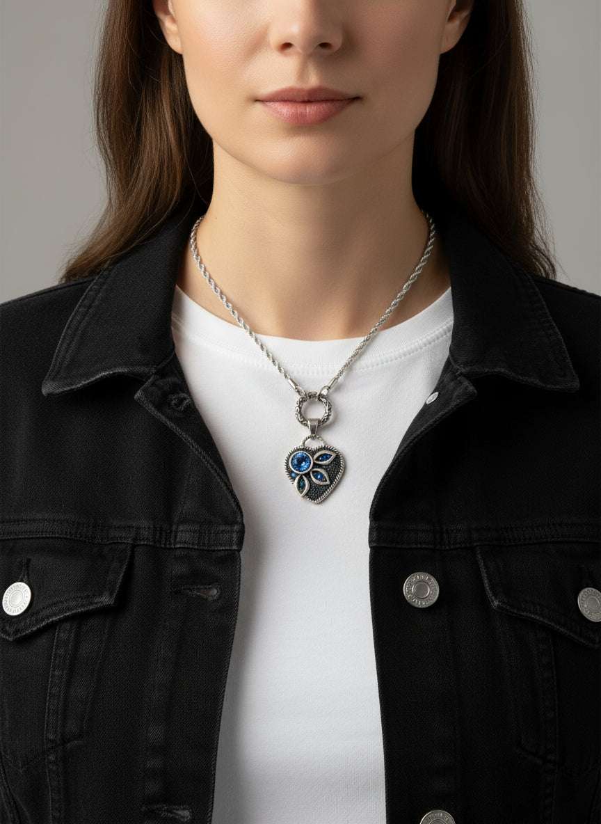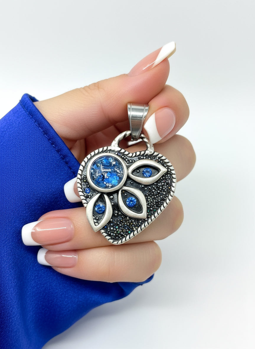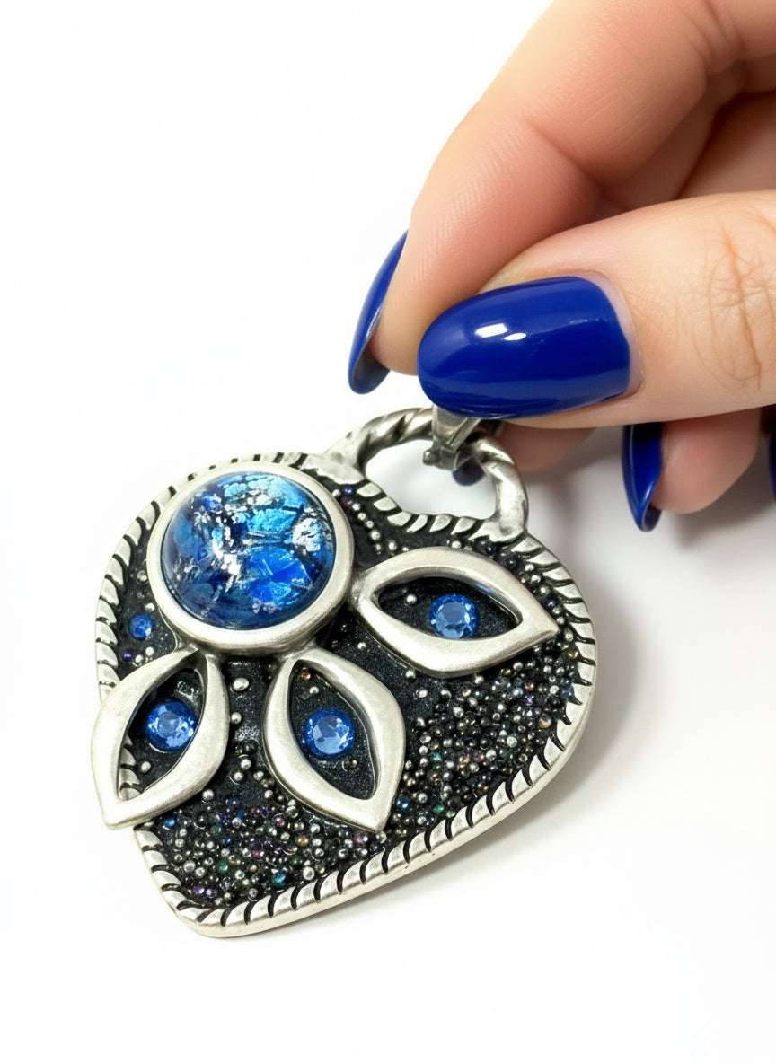 Close-up of blue opal glass heart-shaped pendant with blue crystals and marbled glass stone - handmade in USA