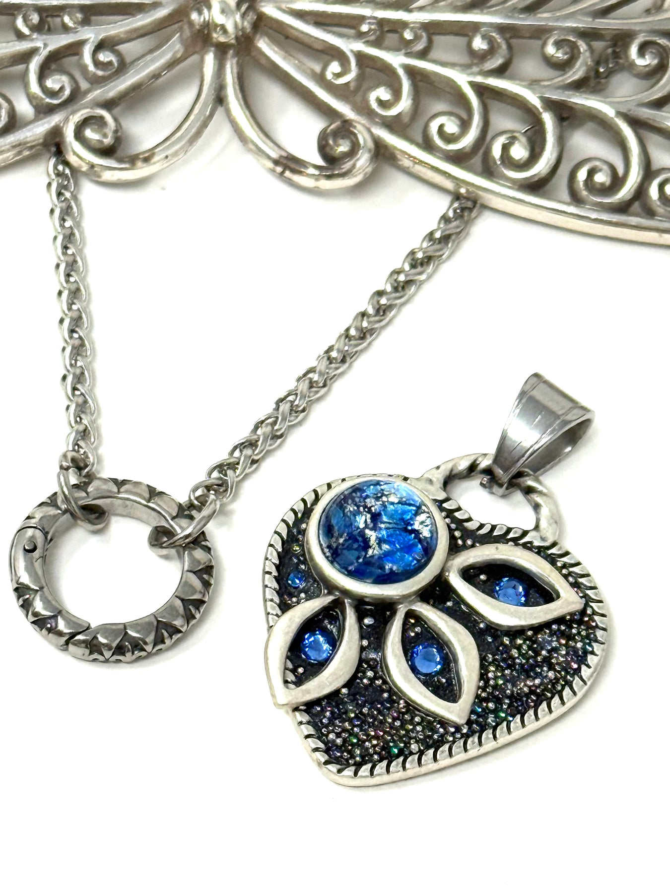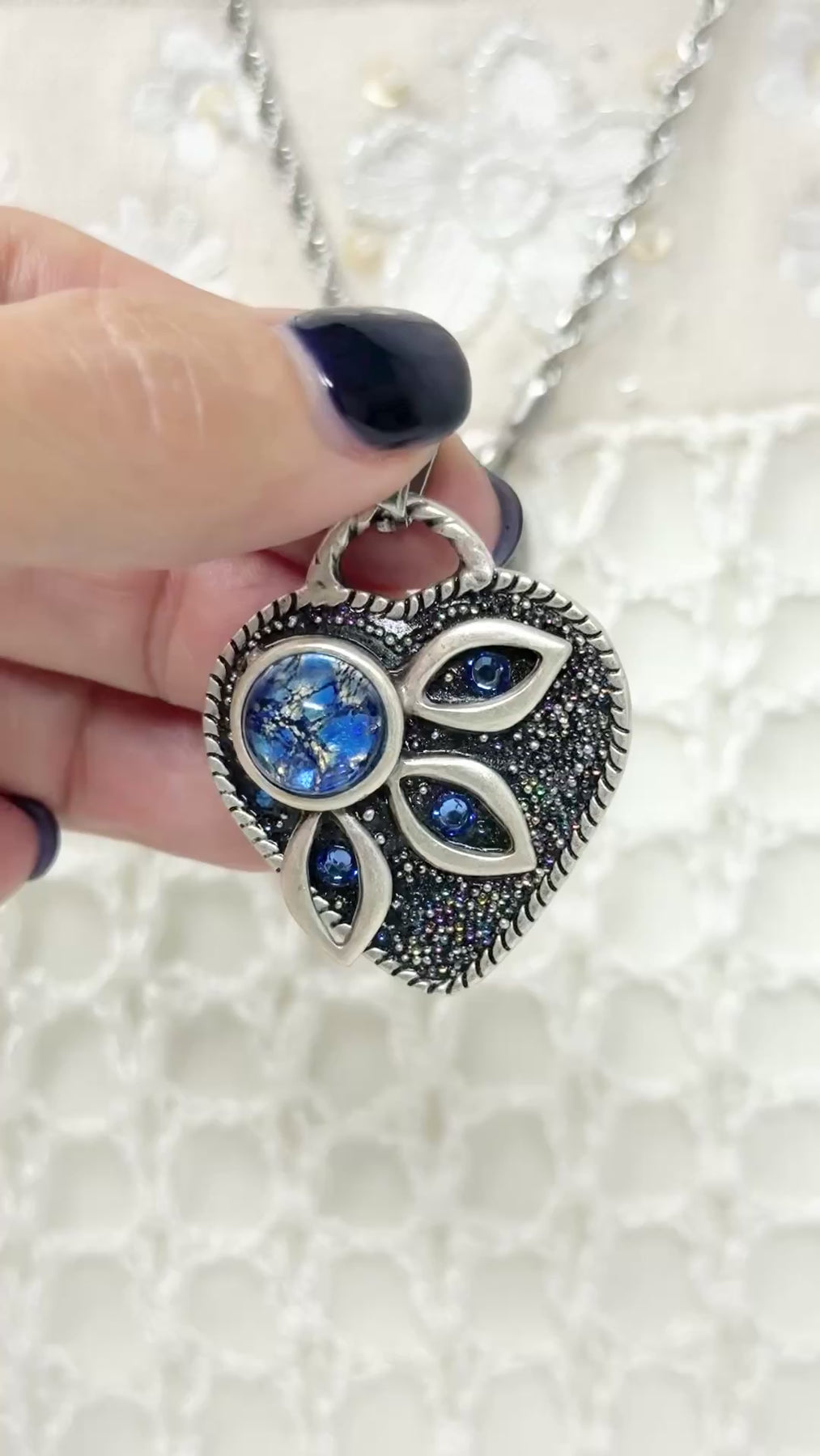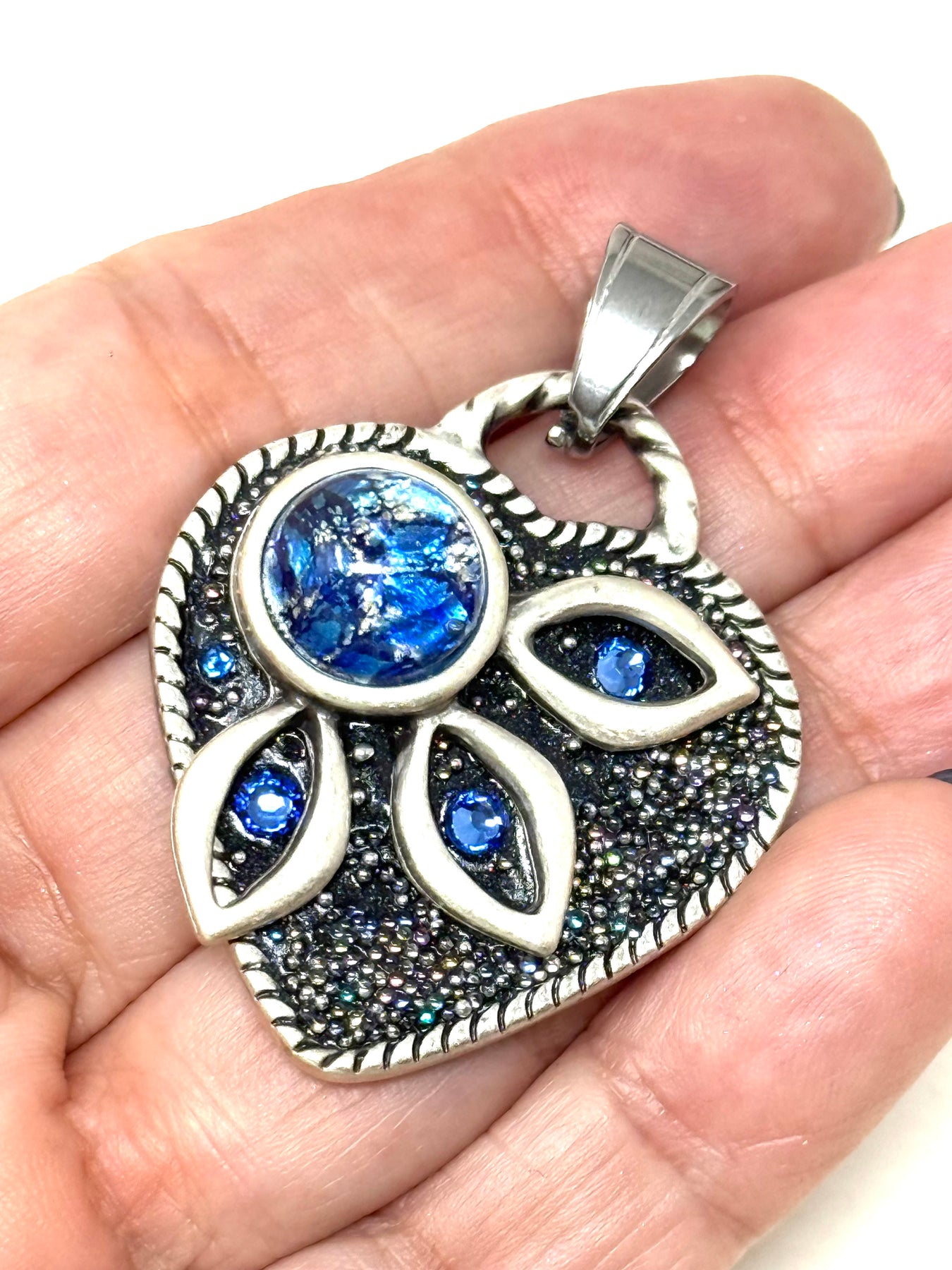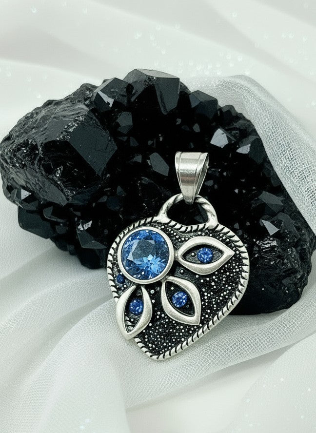 Heart-shaped pendant with blue crystals and glass marbled stone.