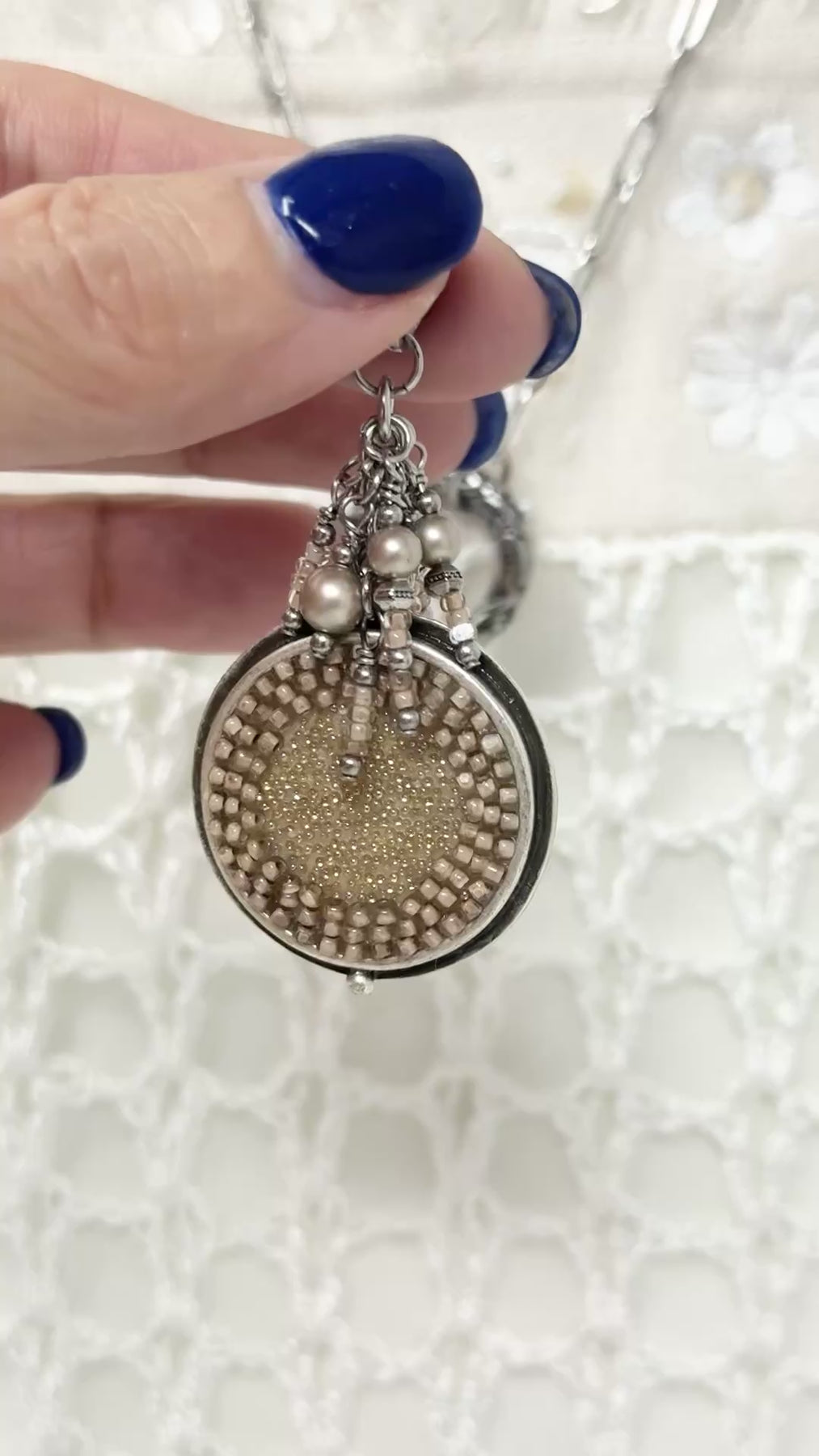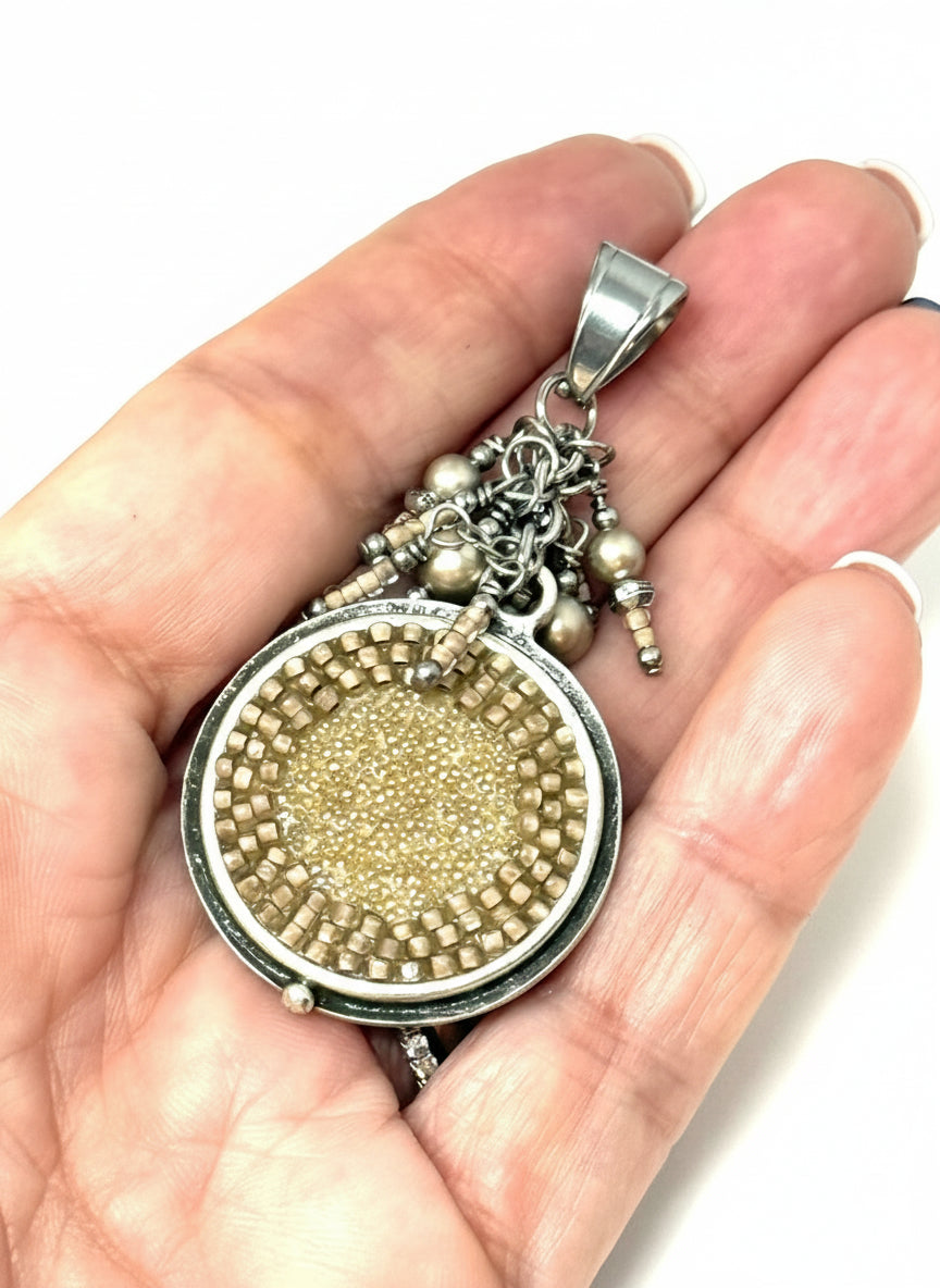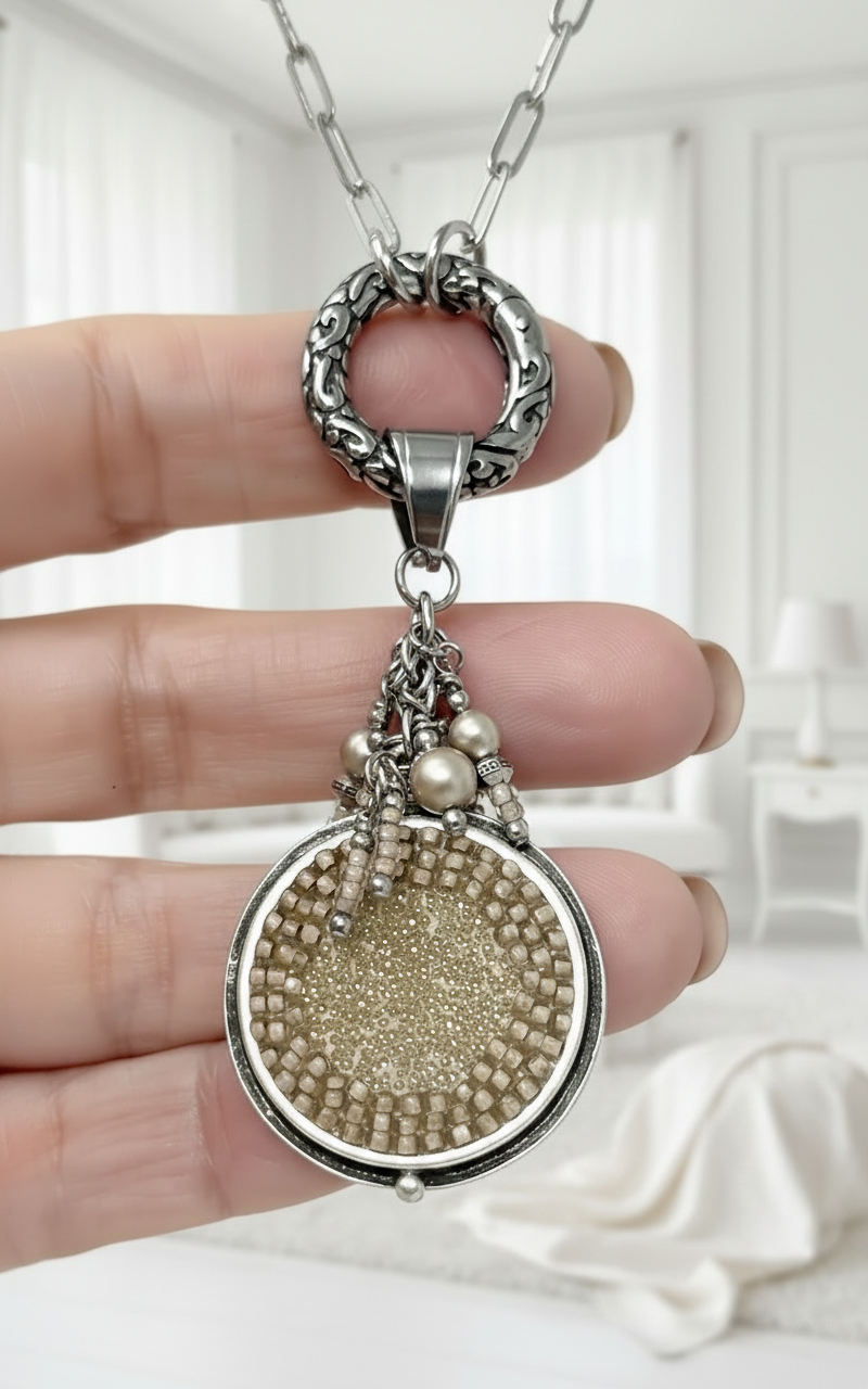 A true testament to fine craftsmanship, this stunning Handmade Golden Beige Pearl & Seed Bead Cascade Pendant is a luminous, multi-textured work of wearable art. It features a genuine golden beige glass shimmer round focal bead complemented by delicate glass seed beads and lustrous pearls that cascade gracefully above, adding texture and depth.