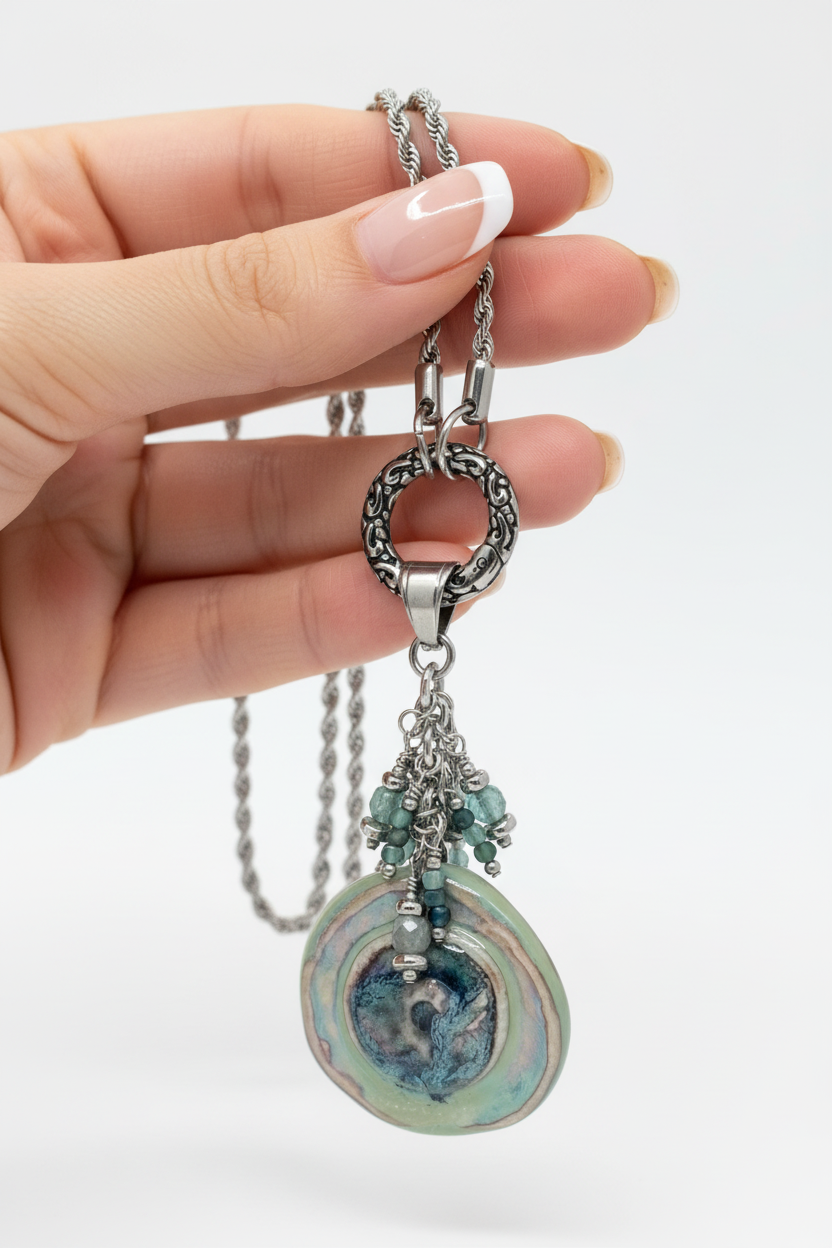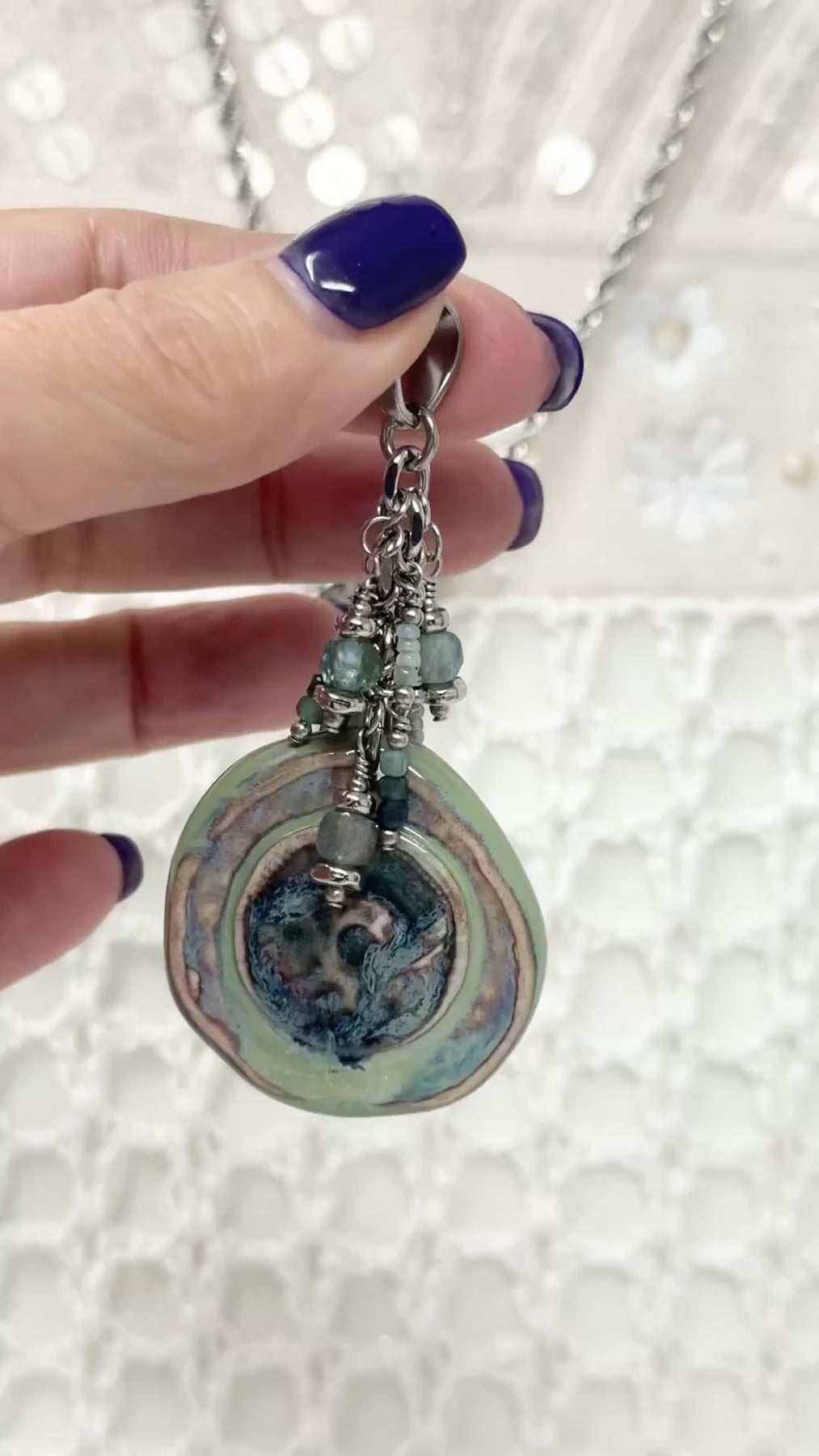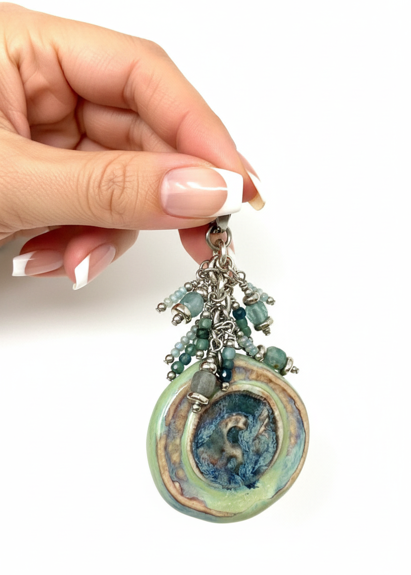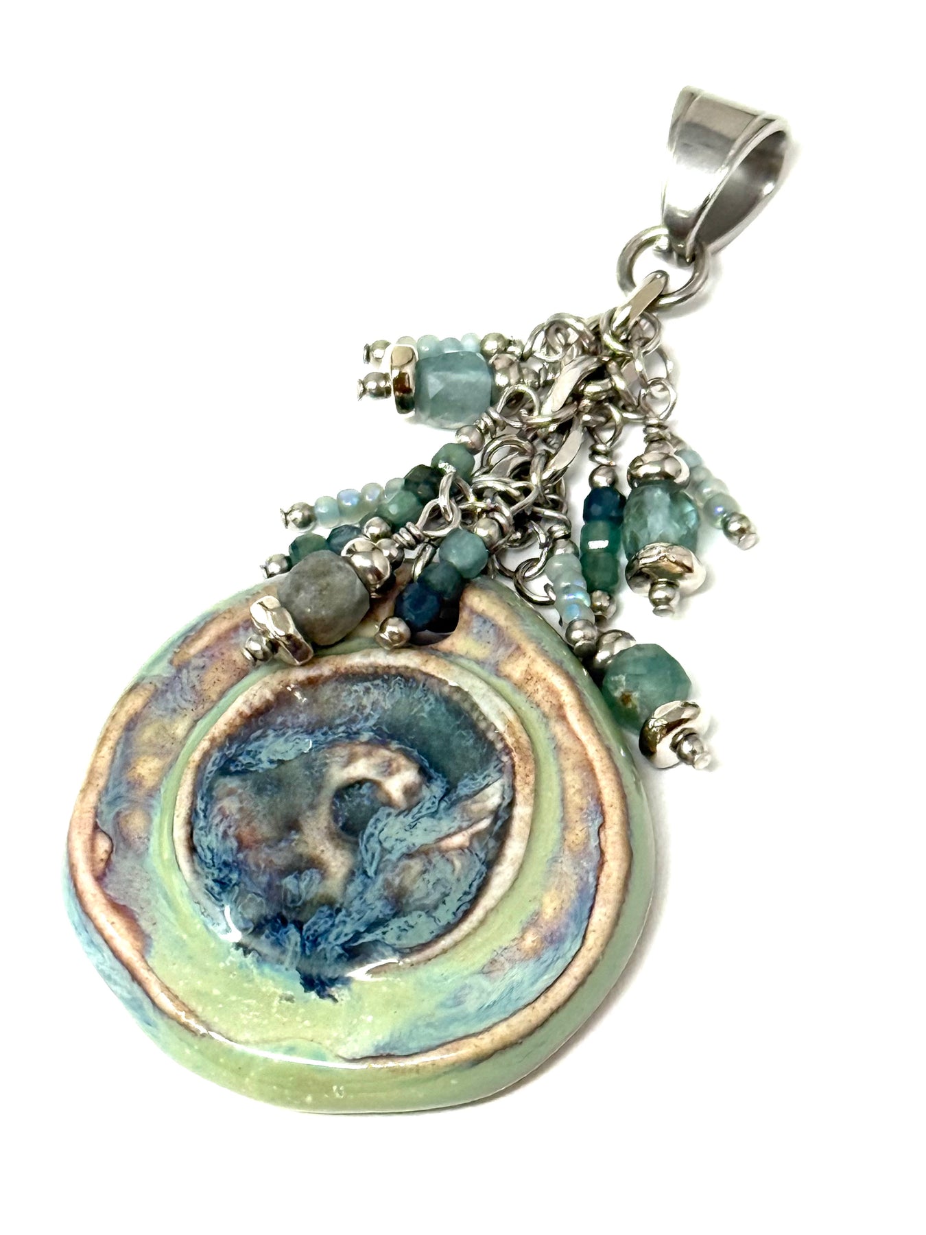 The pendant features a long, chunky cascading beaded cluster crown in coordinating silver, pale yellow, green, teal, aqua, and beige tones, accented with apatite gemstones, aquamarine gemstones, charlotte cut glass seed beads, and rhodium plate beads. Each element is carefully hand-selected to complement the colorful porcelain focal, creating a cohesive, eye-catching design. The stainless steel bail ensures durability and a secure connection to your favorite chain. The vibrant, serene color palette and reversible design make this versatile pendant perfect for spring and summer, artistic gatherings, or adding bohemian statement style to everyday wear.