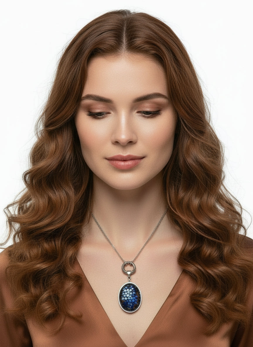 A stunning example of fine craftsmanship, this striking Vintage Glass Bronze and Slate Blue Glass Oval Pendant is a beautiful work of wearable art. It features a genuine vintage glass cabochon in rich slate-blue and bronze tones, with an intricate circular pattern within, creating mesmerizing depth and visual interest.