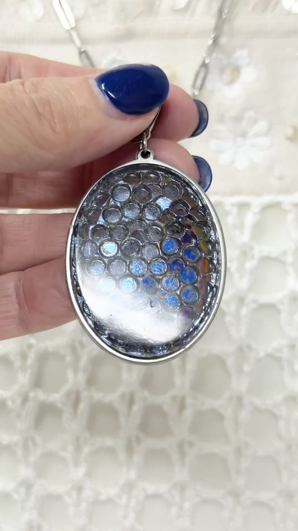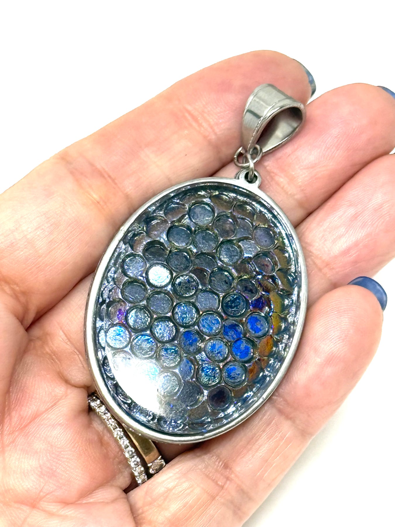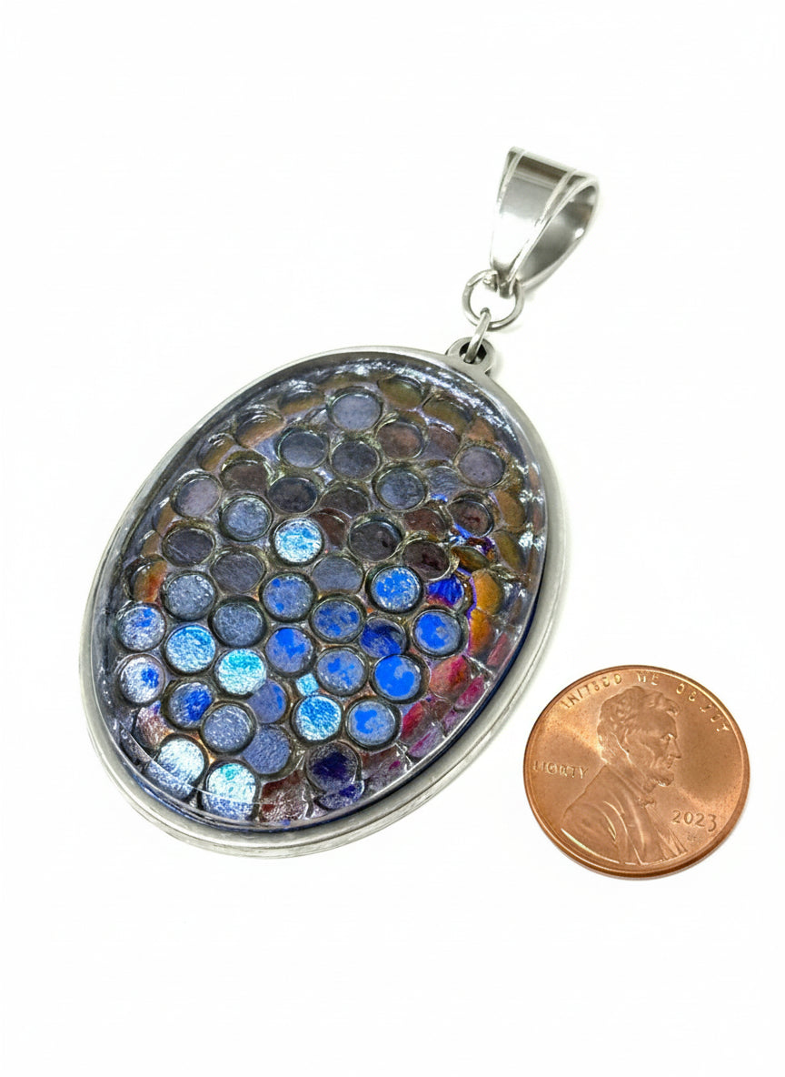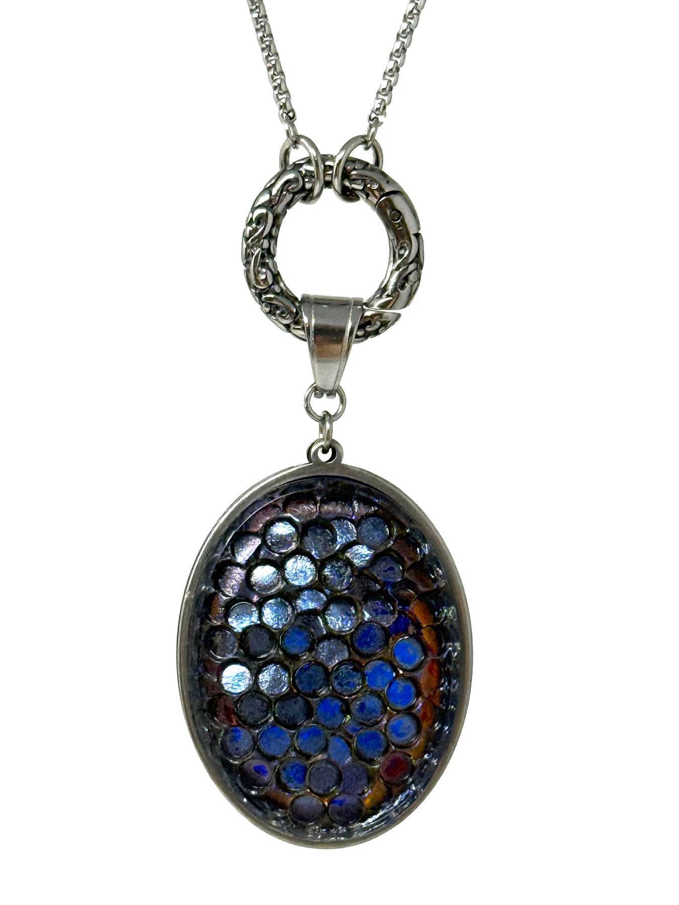 Securely set in a stainless steel oval bezel with a stainless steel bail, this handmade piece offers a versatile, artistic touch to any outfit, with warm bronze and cool blue tones that catch the light beautifully.