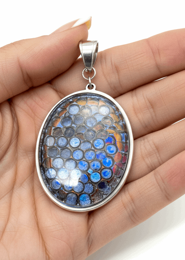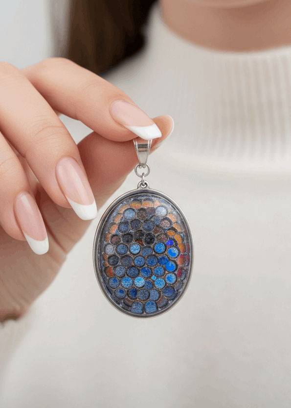 My mosaic pendants are designed for everyday wear. The dichroic glass is securely set in a bezel with Apoxie Sculpt cement—a professional-grade adhesive used by artisans worldwide. While the pendant is durable and water-resistant, I recommend removing it before swimming, showering, or vigorous activity to preserve its beauty for years to come.