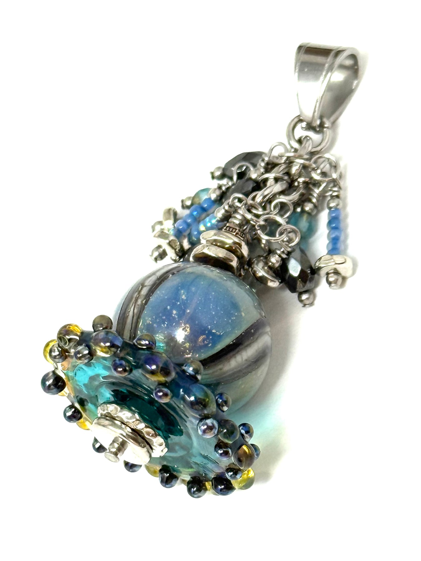 Elegant blue lampwork glass pendant close-up detail view showing silver beadwork and blue glass - handmade by Bead Dangle Design