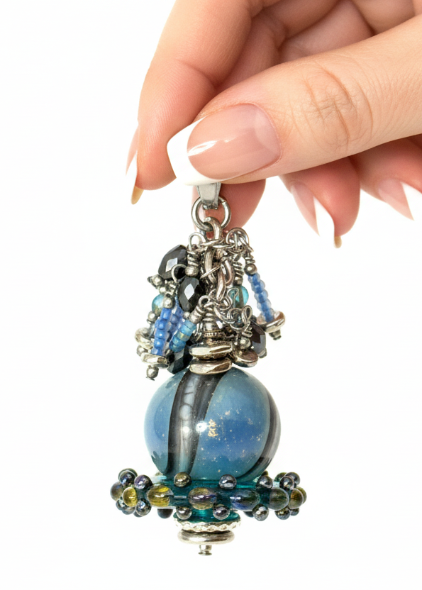 "Elegant blue lampwork glass pendant with silver beadwork held by model hand-held view - handmade by Bead Dangle Design"