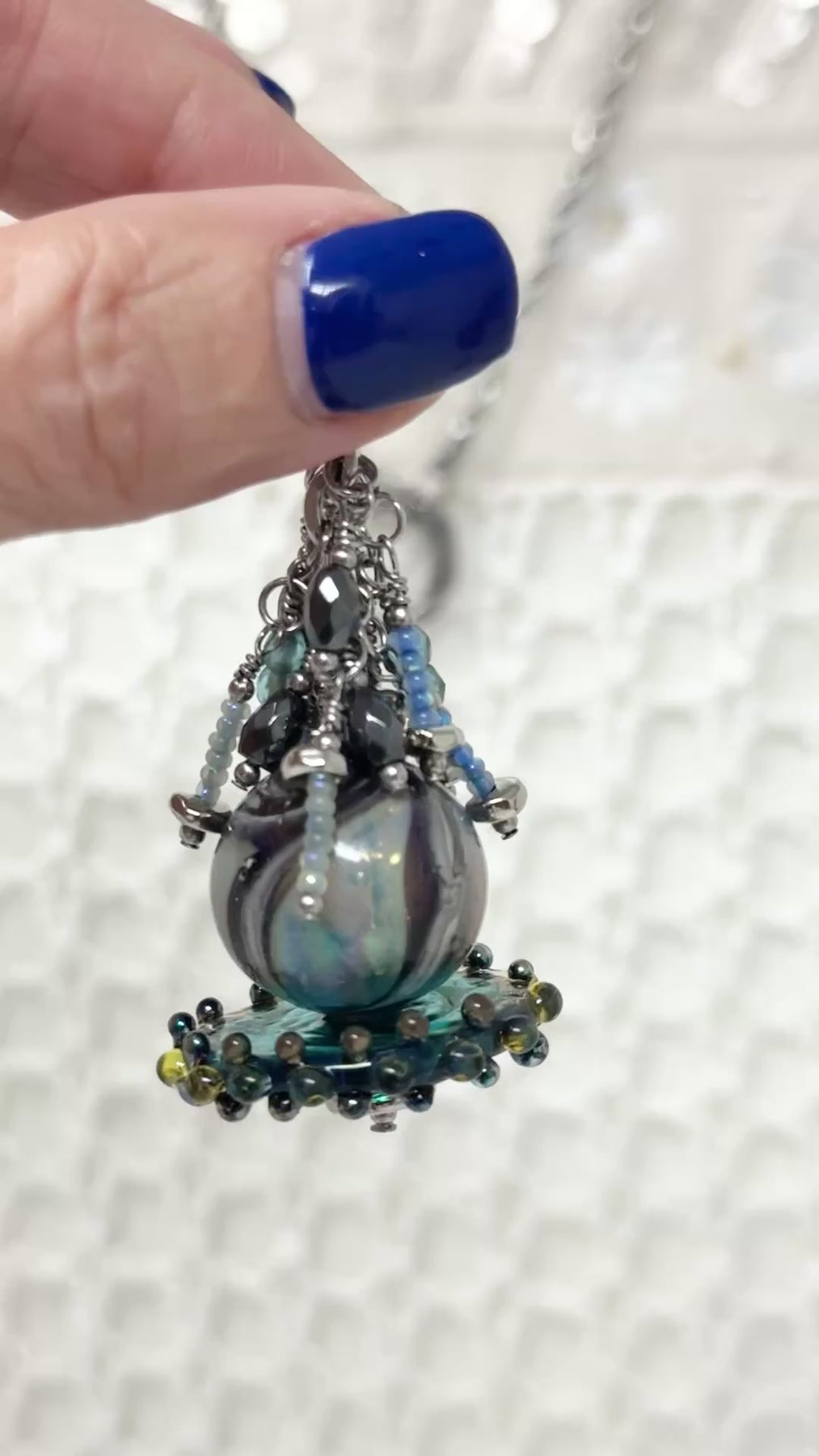 • Focal Bead: Features a stunning handmade lampwork and blown glass focal bead with mesmerizing swirls of slate blue, charcoal gray, and white that create depth and dimension
