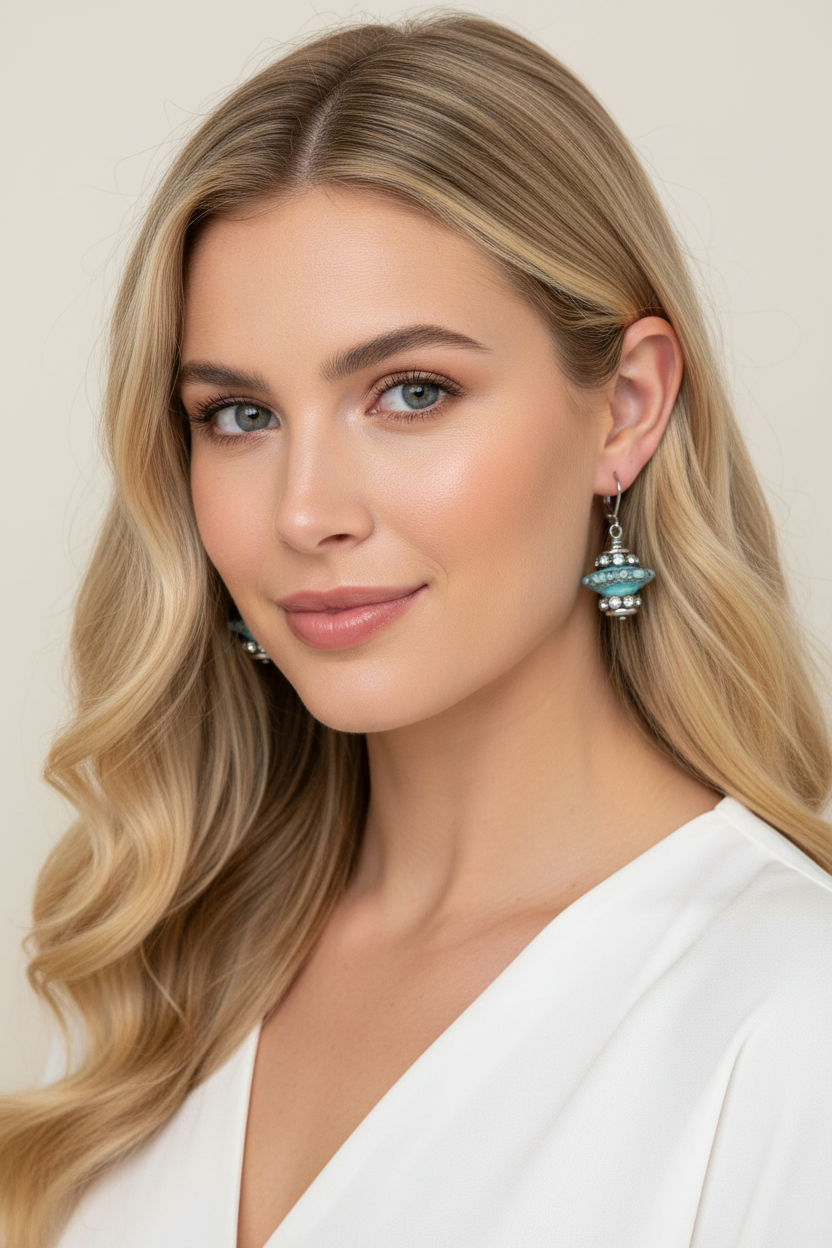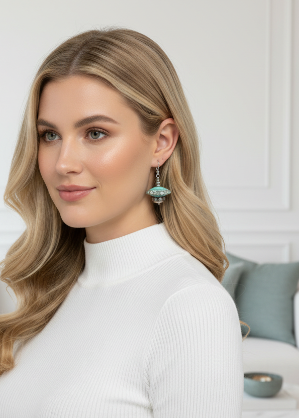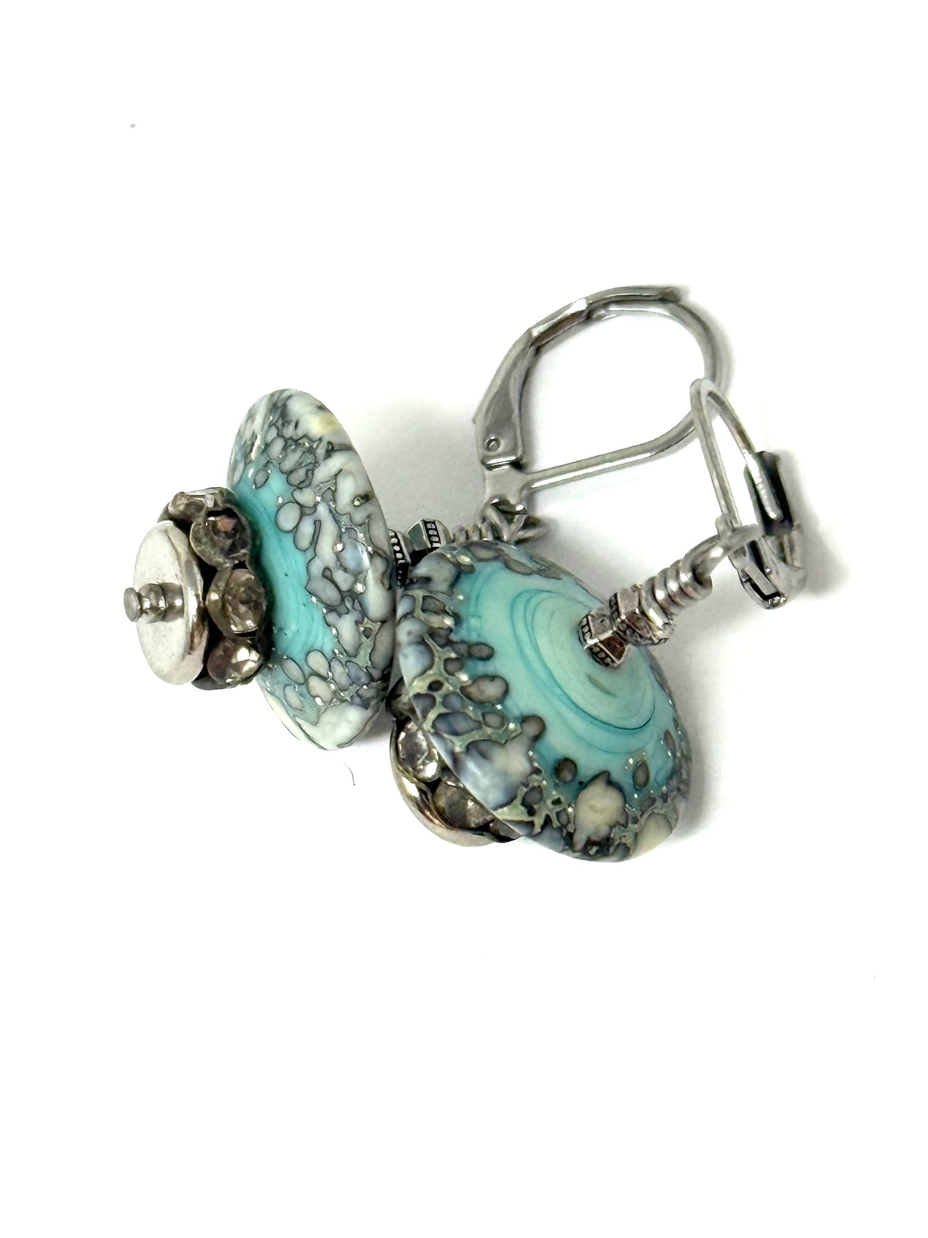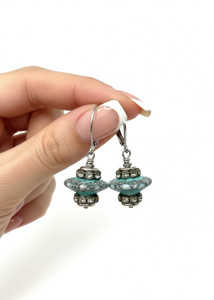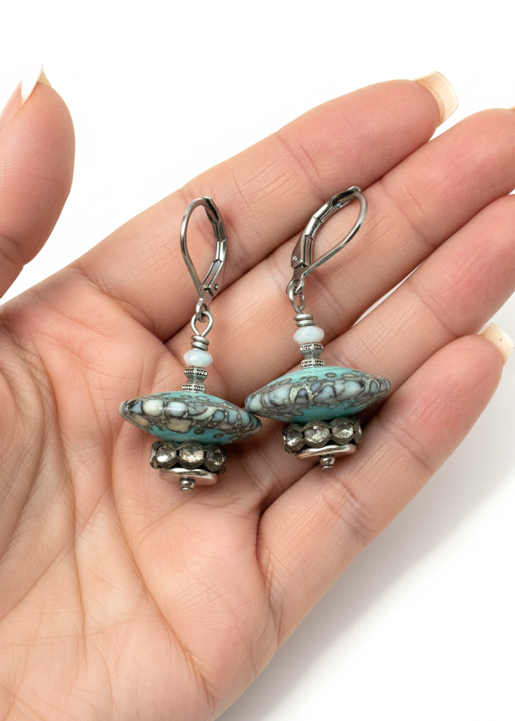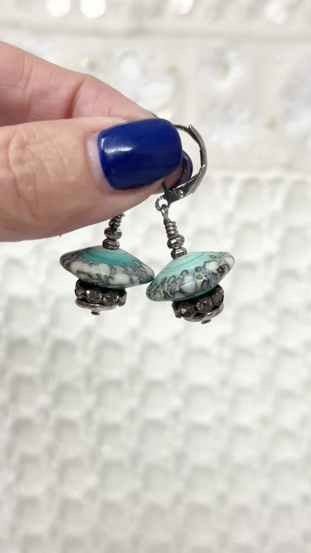Coastal charm meets artisan elegance in these playful Fun Turquoise Lampwork Disc Earrings. Each earring features handmade lampwork glass bicone disc beads in mesmerizing turquoise, teal, gray, and white speckled patterns that capture light beautifully. The marbled glass creates an iridescent effect that shifts with every movement, making these earrings truly eye-catching.
