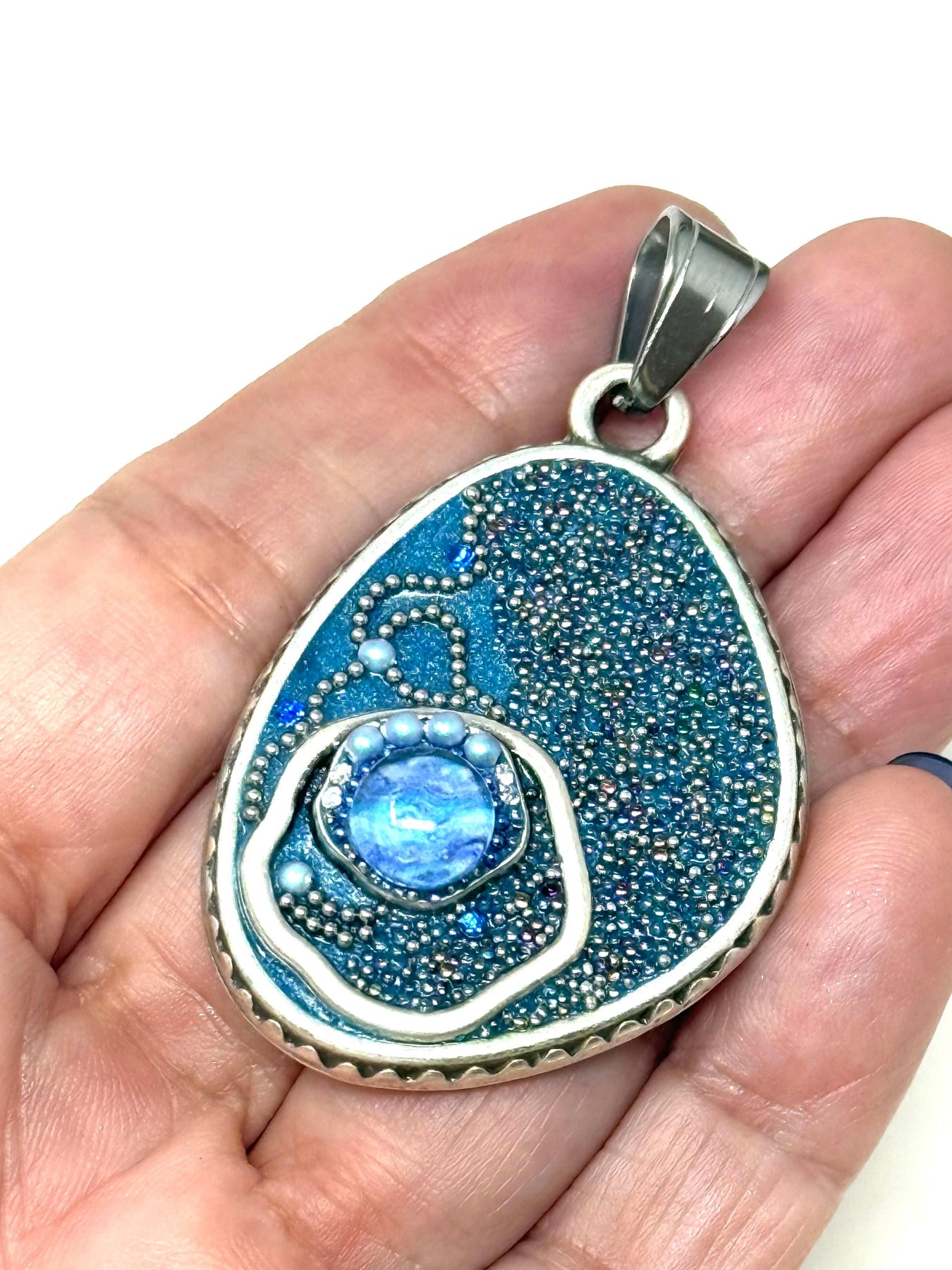- Add this pretty Handmade Blue Pearl Shimmer Beaded Pendant Necklace to your jewelry collection today.