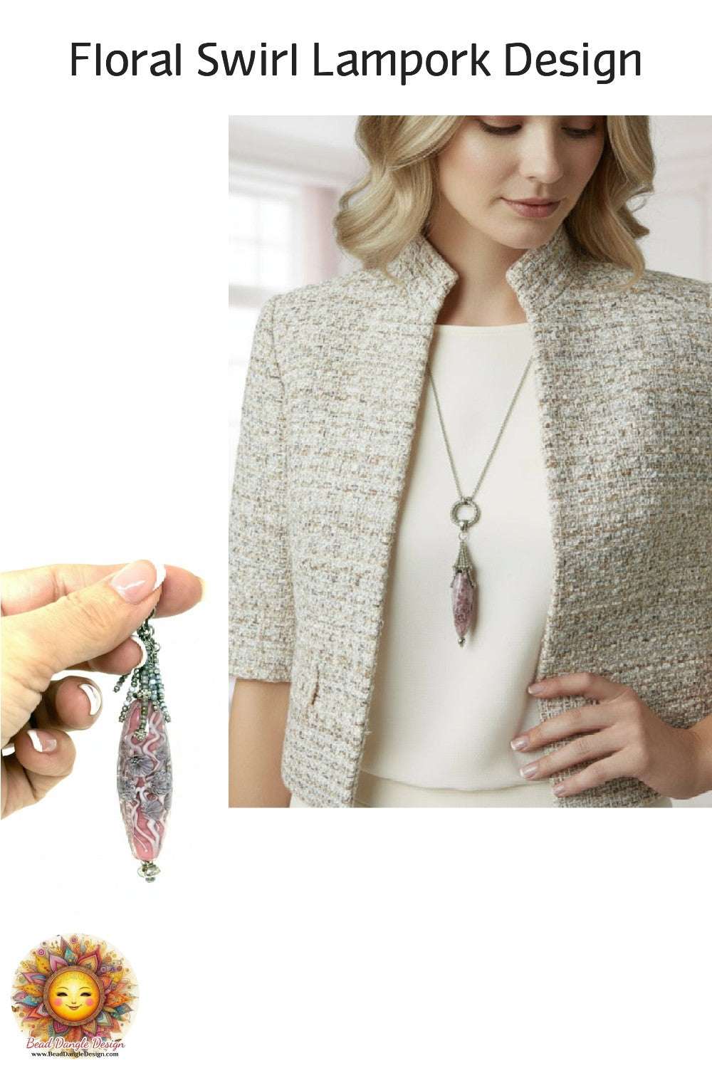 Floral swirl lampwork pendant collage showing elegant lifestyle and detail views - handmade artisan jewelry by Bead Dangle Design