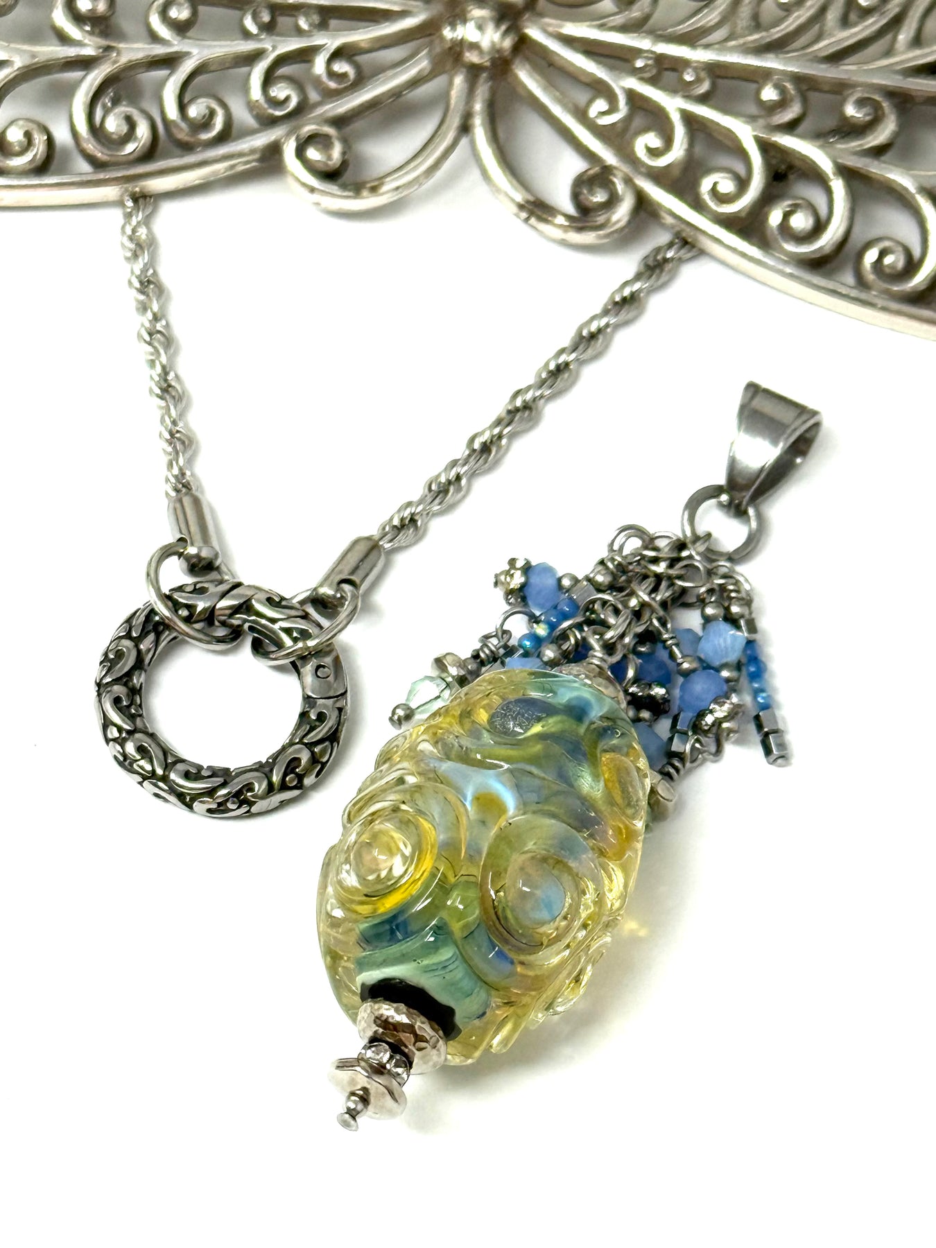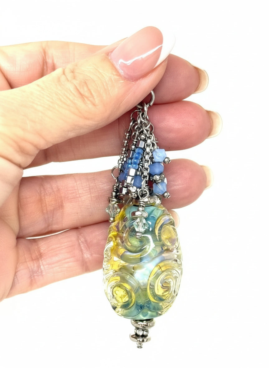 Focal Gemstone: Features a chunky lampwork glass bead with vibrant colors and artistic detail