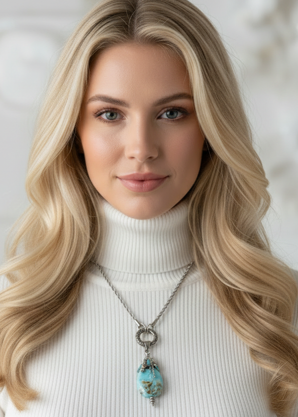 This captivating Boho Turquoise Lampwork Glass Swirl Pendant brings coastal charm and artisan elegance together with its stunning hand-sculpted focal bead and eclectic gemstone cascade. The breathtaking handmade lampwork glass focal bead features mesmerizing swirls of pale turquoise blue with rich brown and golden accents, creating an organic, free-flowing pattern that's beautifully detailed on both sides - making this a truly reversible, double-sided treasure.