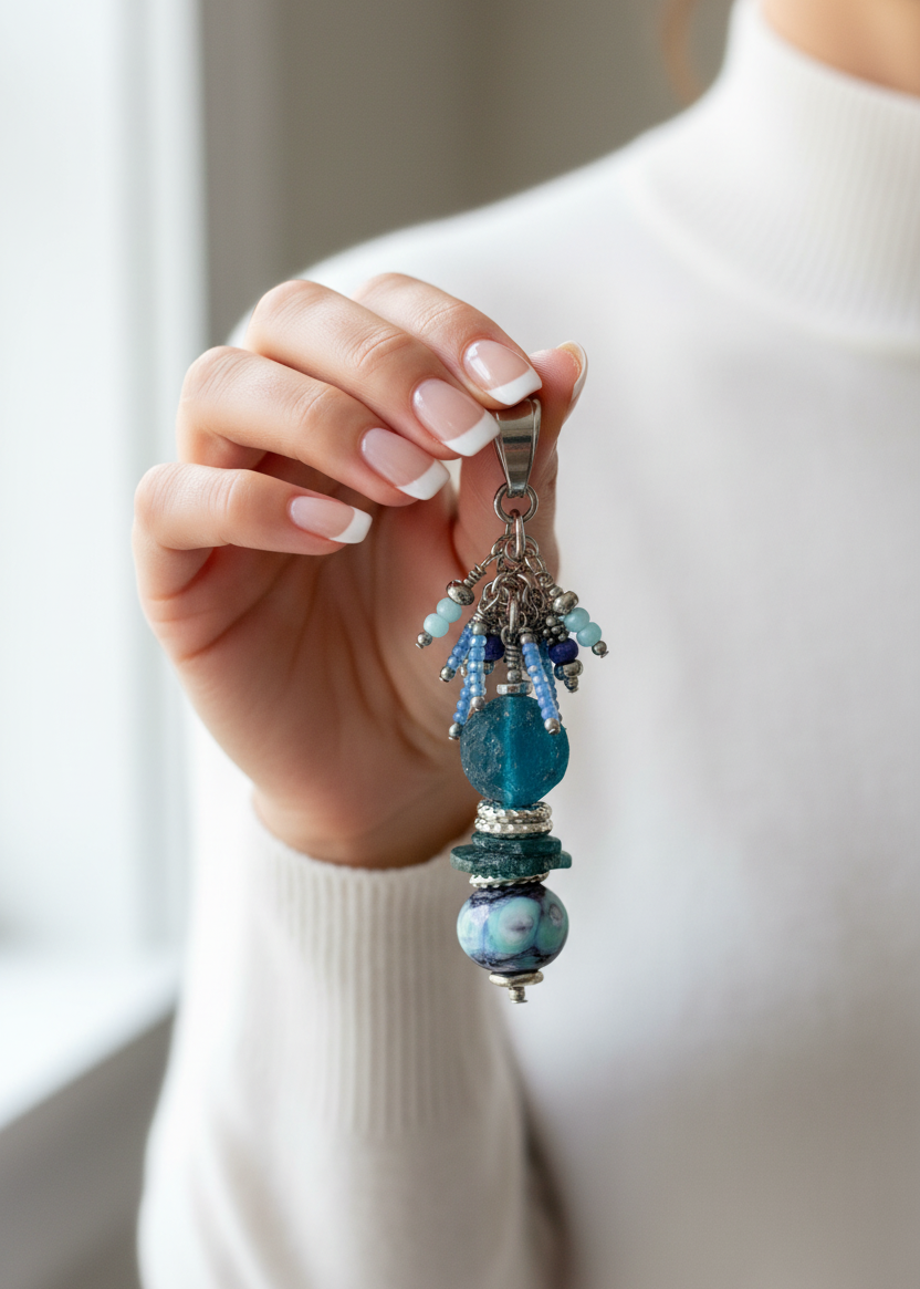 The pendant is crowned with an intricate beaded cluster featuring chateau glass seed beads, faceted Czech glass beads, and porcelain beads in coordinating ocean-inspired blues and teals, accented with oxidized pewter beads that add vintage bohemian character. Each bead is meticulously hand-set with stainless steel components to create a cascading arrangement that adds sparkle, texture, and movement. The stainless steel bail ensures durability while complementing the earthy, coastal color palette. This pendant embodies free-spirited boho style, perfect for beach lovers, adding ocean-inspired beauty to casual wardrobes, bringing coastal vibes to festival fashion and vacation adventures, or gifting to someone who treasures nature-inspired artisan jewelry.