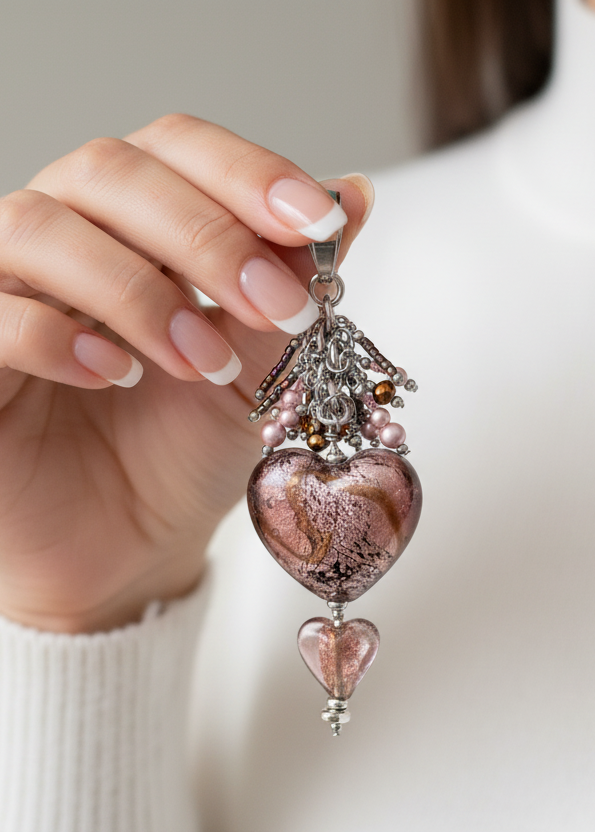 Romantic elegance meets artisan craftsmanship in this stunning lampwork glass heart pendant. A gorgeous Lampwork Heart Pendant features a substantial hand-crafted lampwork glass heart focal bead showcasing mesmerizing metallic gold and bronze foiling swirled through soft pink and mauve tones, adorned with delicate shimmer and depth that catches light from every angle. The artisan-crafted lampwork heart captures light beautifully, creating an iridescent glow that shifts with every movement.