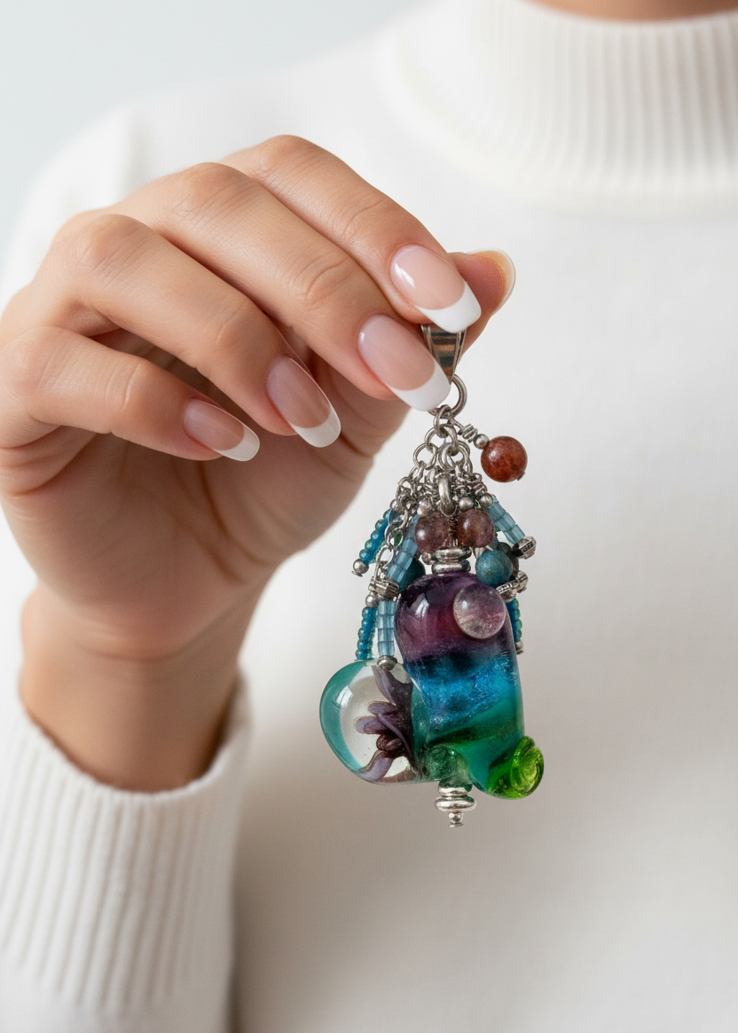 This is a truly unique piece - once it's sold, it can never be recreated. Each lampwork bead is individually crafted by a glass artist, making this pendant truly one-of-a-kind. When you wear this pendant, you'll own the only one in existence. Each bead is hand-set with care, making this pendant an exclusive work of art that is yours alone.