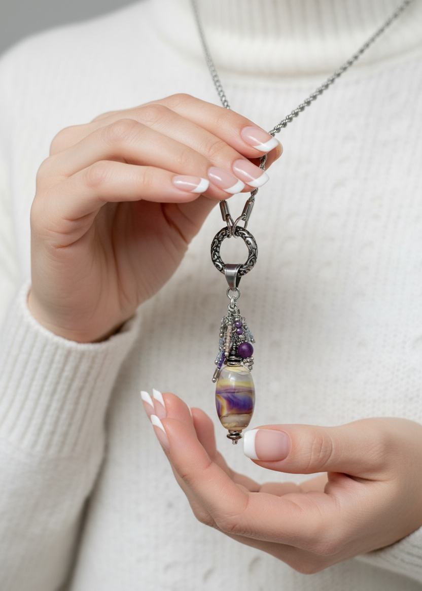 The pendant features an elegant beaded cluster crown in coordinating purple textured Czech glass beads, cream glass chateau seed beads, teal accents, and Czech faceted glass beads, beautifully complemented by oxidized pewter beads and decorative elements. Each bead is carefully hand-selected and hand-set to create a cohesive, sophisticated design that enhances the lampwork focal. The stainless steel bail ensures durability and a secure connection to your favorite chain. The elegant color palette and iridescent shimmer make this pendant perfect for special occasions, evening events, adding sophistication to professional attire, or elevating your everyday style with artisan elegance.