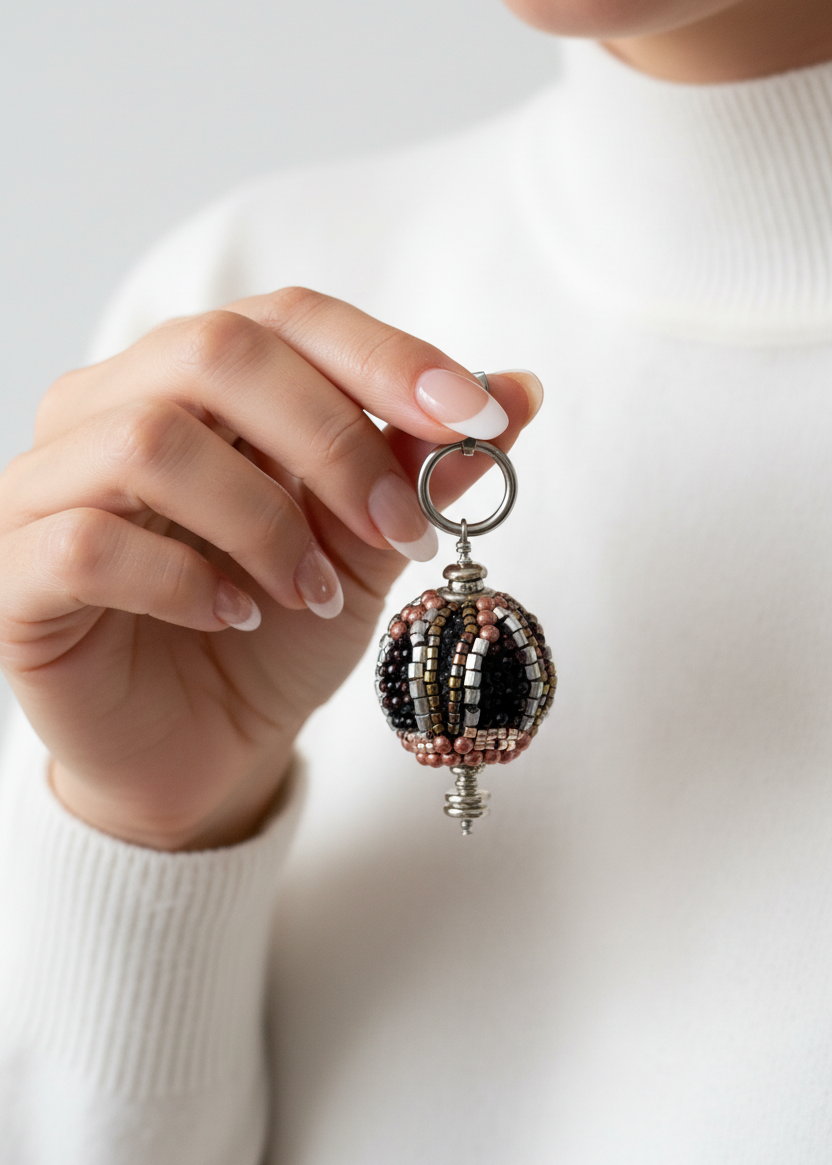 - Focal Design: Circular cluster pendant with intricate seed bead work in soft pink, charcoal gray, black, and metallic silver creating sophisticated dimensional texture